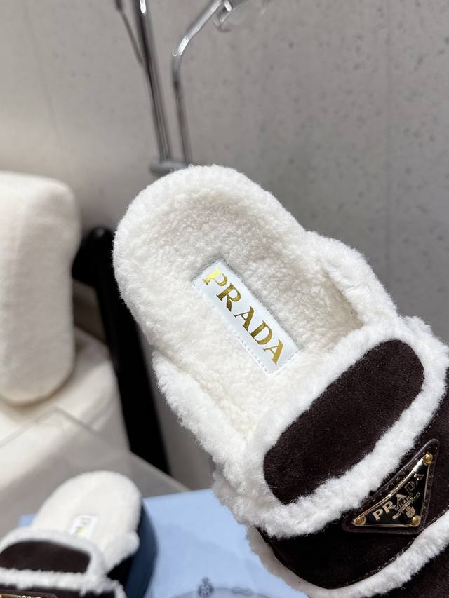 Prada 普拉达 秋冬新款厚底包头毛毛拖鞋 半拖 最新走秀系列 经典升级 舒适度与时髦度并存 每个颜色搭配都好看,设计搭配不同风格需求 鞋面:原版定制牛猄 内里: 进口羊毛 大底:发泡防滑大底 鞋码: 35-41 40 41定做