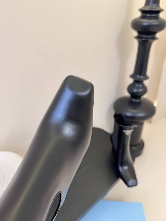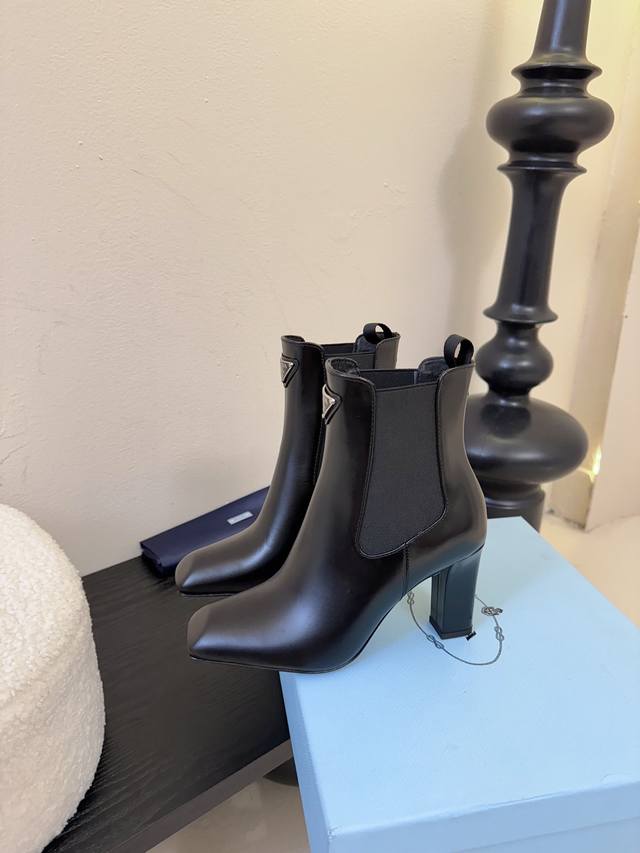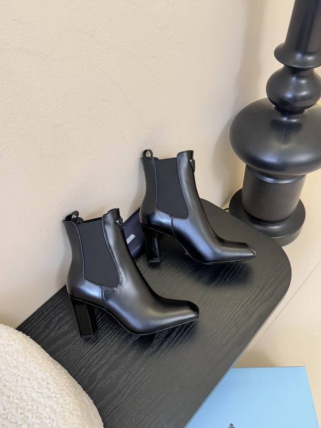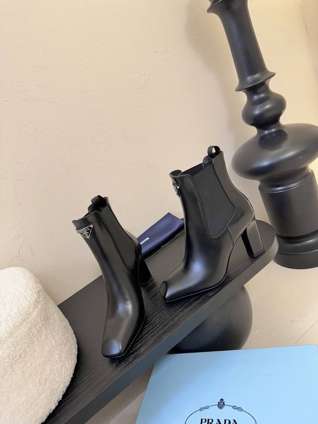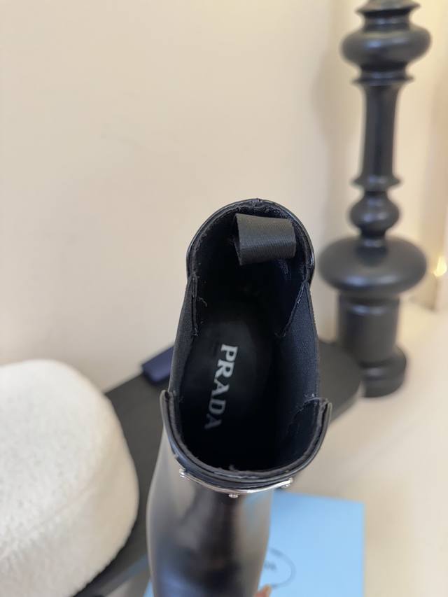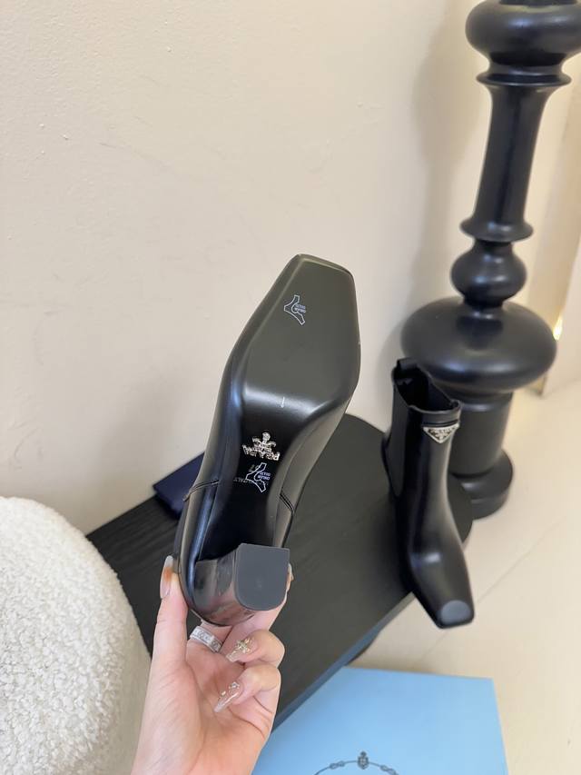 Prada 普拉达 25 最新款走秀款靴子 上脚太舒服 方头设计加上普拉达独特三角标着让人不爱也不行的9公分小跟设计拉长比例又好走 鞋面:开边珠 牛漆皮 内里: