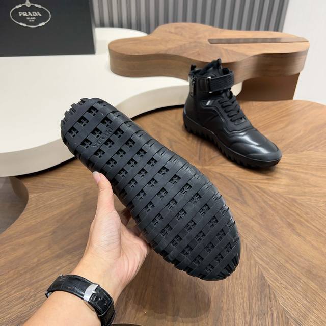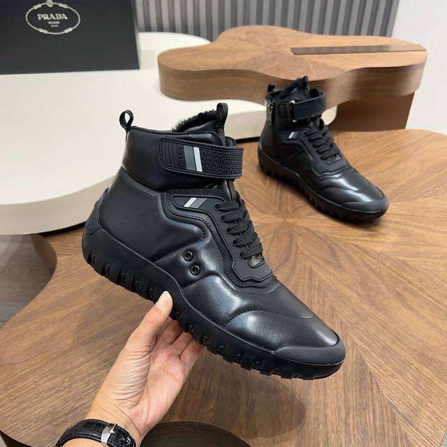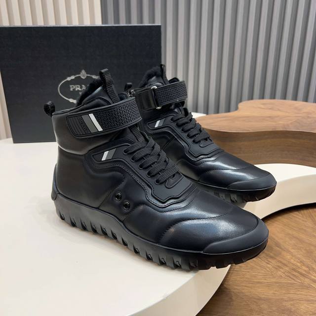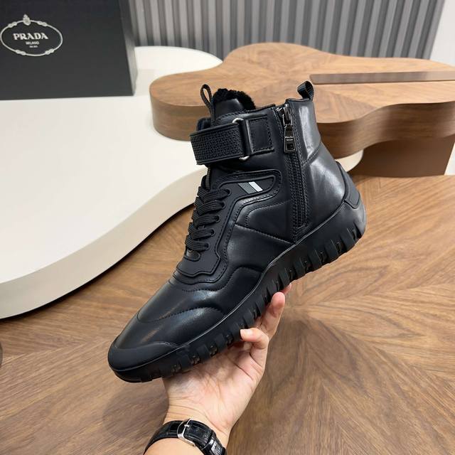 prada 普拉达 Toblach男士高帮羊毛鞋出货莞产顶级猛货! Ddd 这款极简风格高帮运动鞋以1998年秋冬时装秀中展示的标志性prada Linea Rossa经典款式为灵感设计。颠覆性的轻便加宽4Cm橡胶鞋底饰有别具一格的红色Linea Rossa徽标,令人联想起原版设计创新的二元性内核,而哑光小牛皮面则彰显出精致的现代气质。套脚设计,简约光面风格,内侧配有专属五金拉链开合,穿脱更方便快捷,羊毛一体,保暖锁温,配以徽标牛皮拼羊毛可拆卸鞋垫,上脚舒适透气,休闲百搭。配全套原包装防尘袋! Ddd 尺