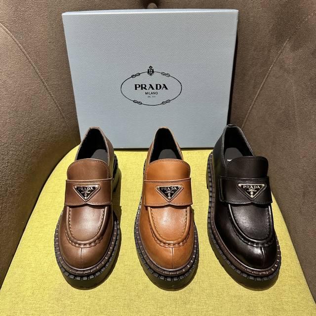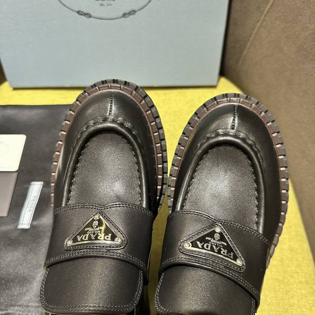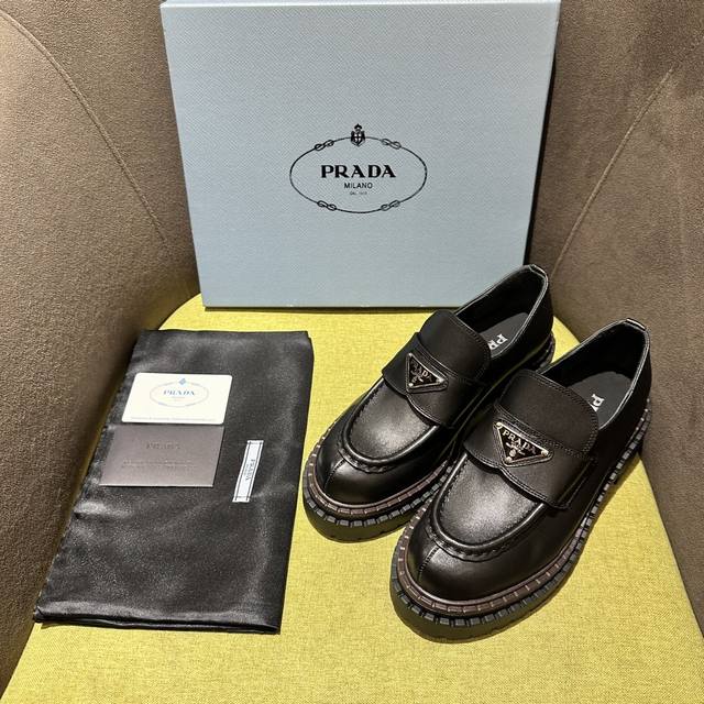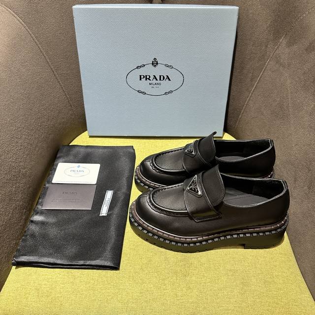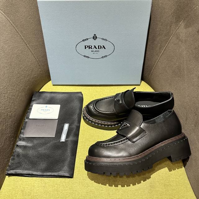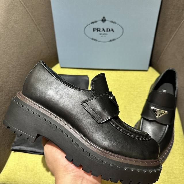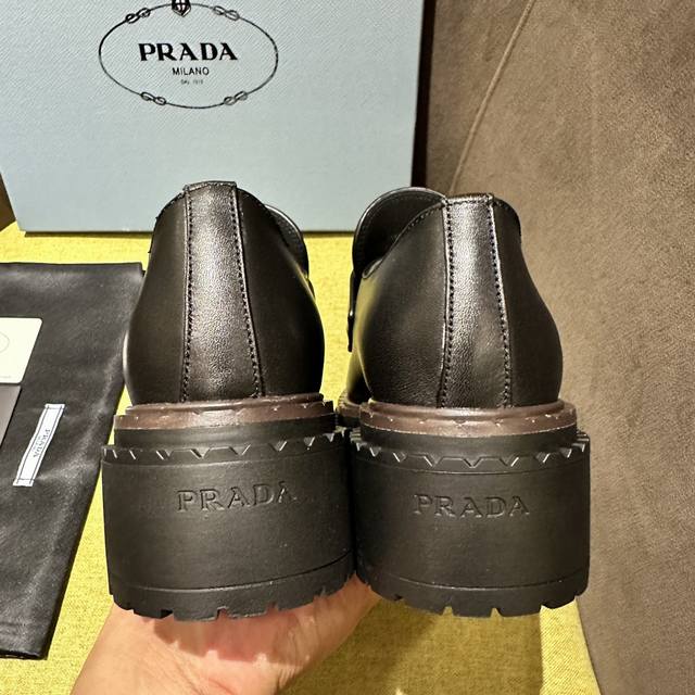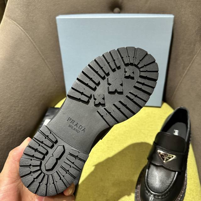 Prada 普拉达 Wa 秋冬新款 这款皮革乐福鞋采用厚实鞋底,匠制细节与当代元素增添活力,以全新时尚语言诠释经典。 涂珐琅三角形金属徽标 高度55毫米闪亮登场 小红书各大博主推荐,1-1开发 彰显经典魅力。 牛皮内里 Tpu大底真皮沿条 码数:35一42 40-42定做不退换 出厂价Pp: