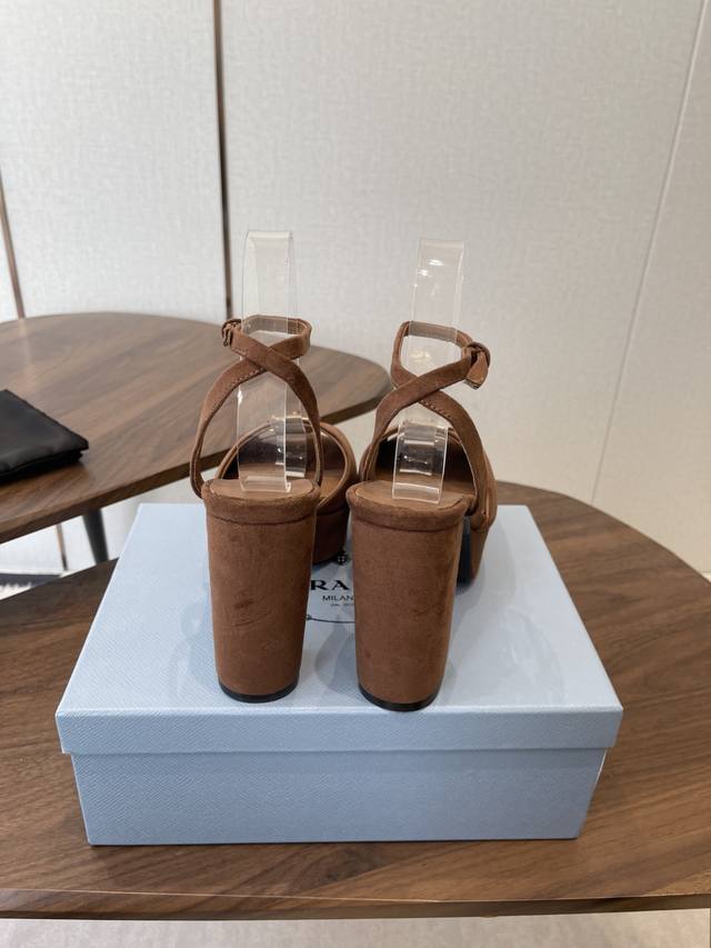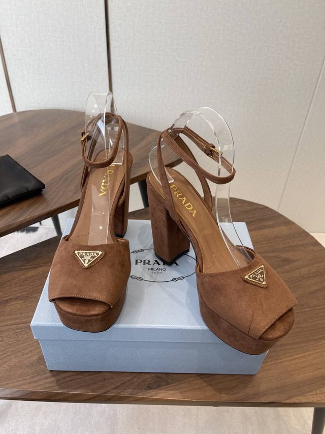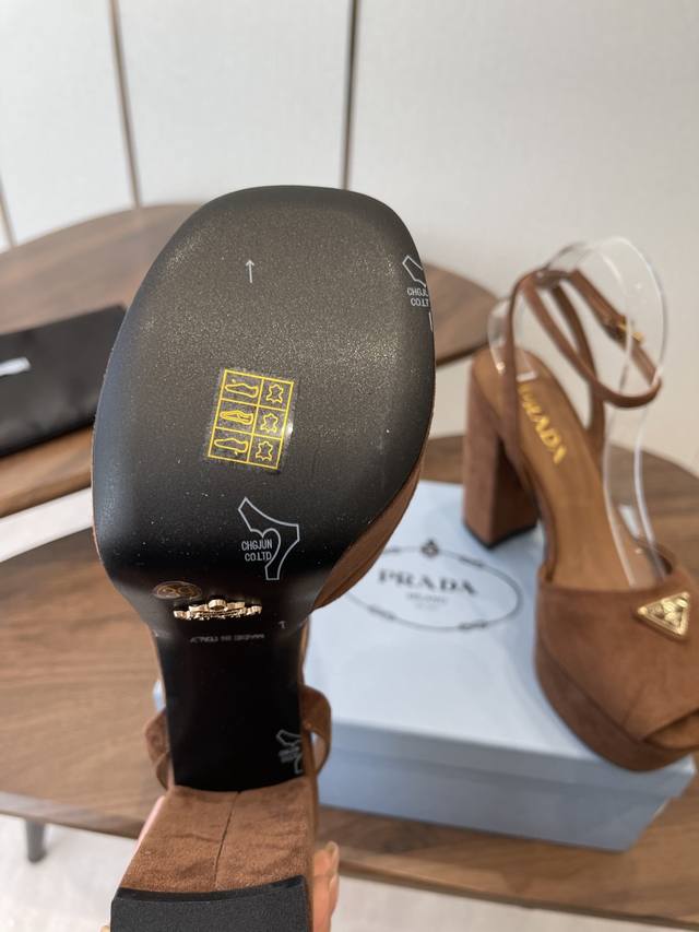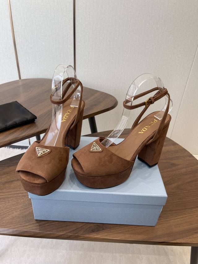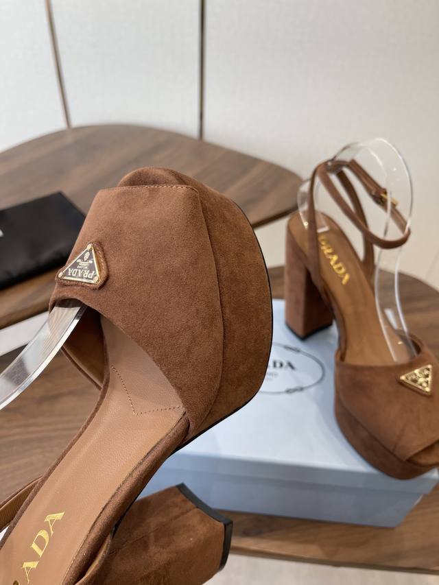 Prada26Ss春秋季新品 Saffiano高跟厚底绒面皮凉鞋,秉承现代设计理念,绽现精致魅力。 织物的新雅色彩平添明艳格调。标志性三角形徽标彰显品牌特色。此