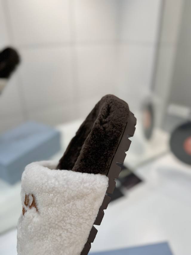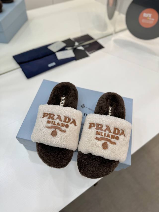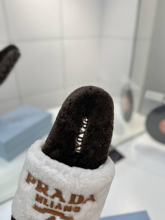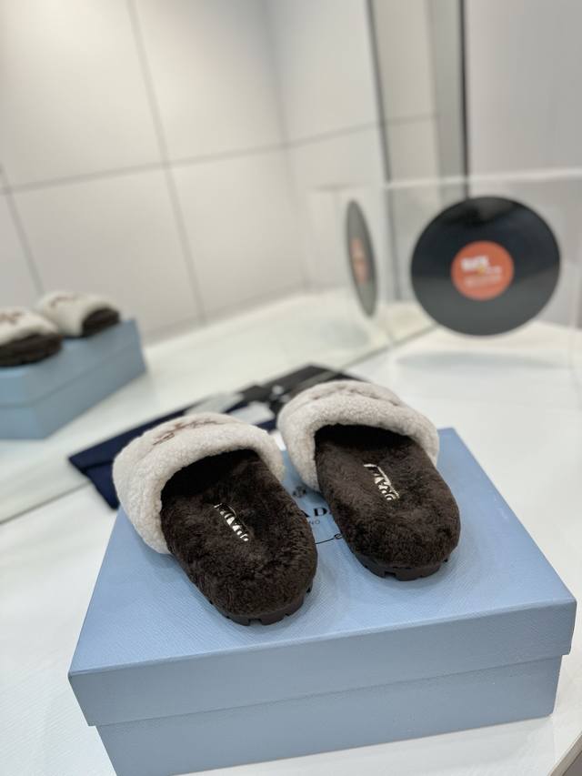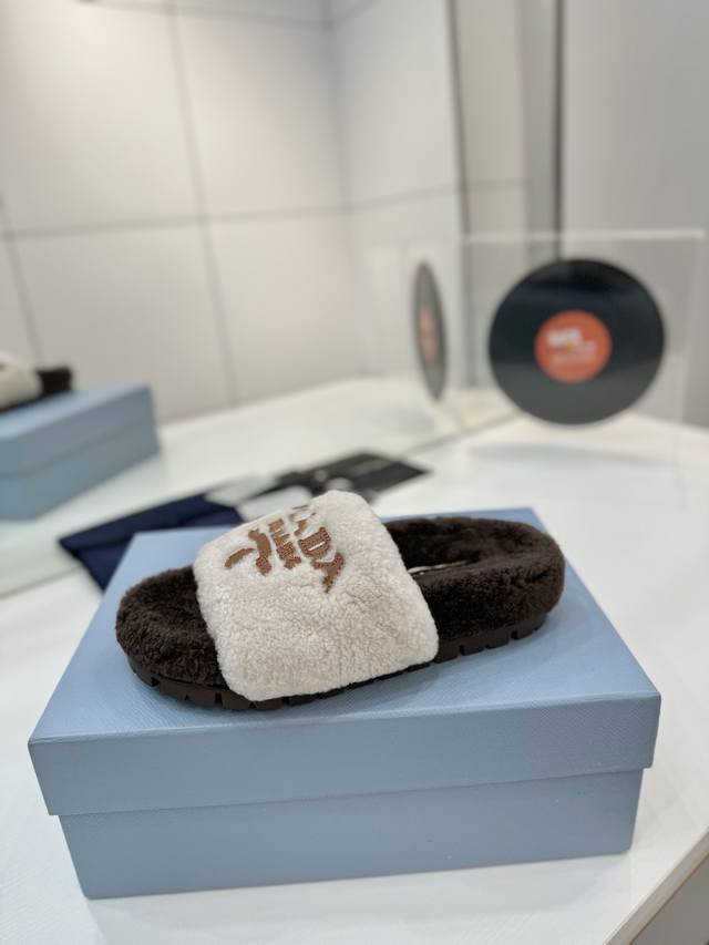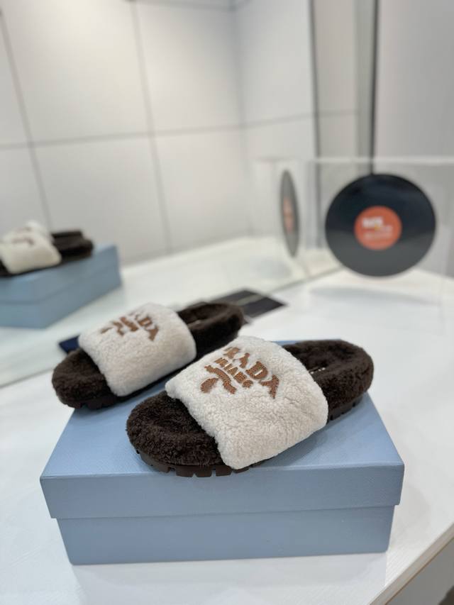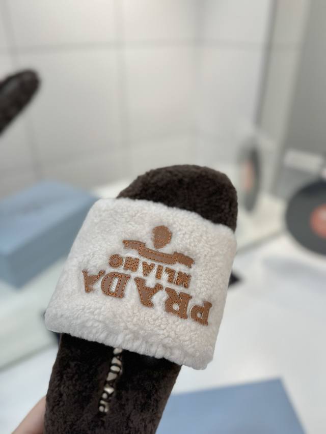 出厂价P 普拉达秋冬新款毛拖,毛毛鞋,可外穿 不管居家还是外穿都是品味的象征性! 秋冬搭配袜子 那更是太绝太绝了 鞋面:进口澳洲真羊毛 手感细腻柔软丝滑 大底: