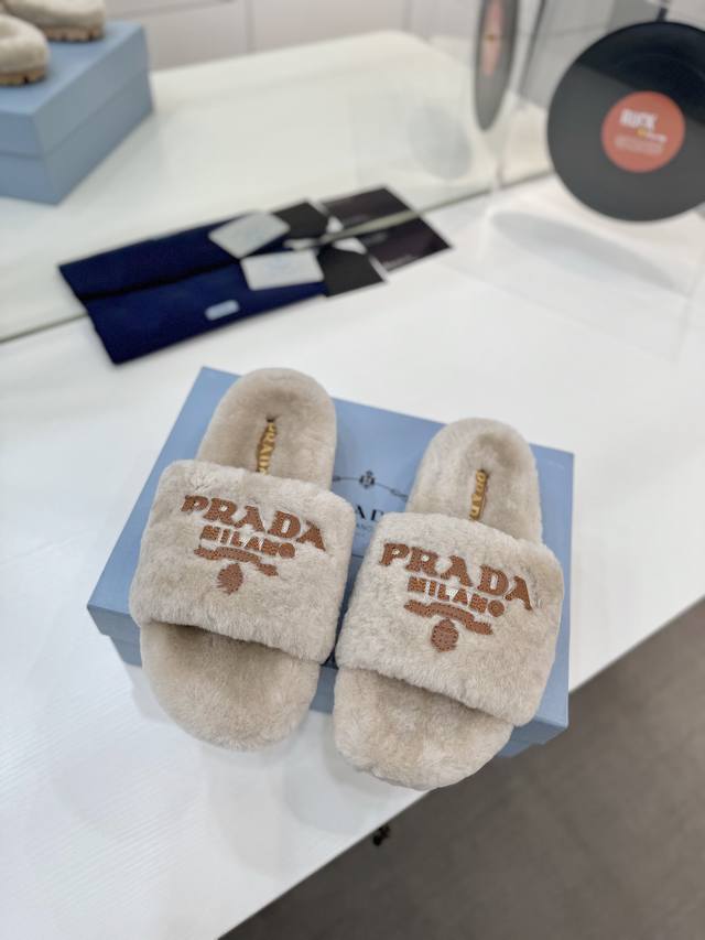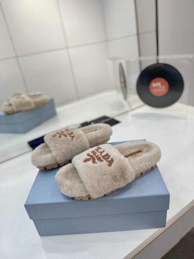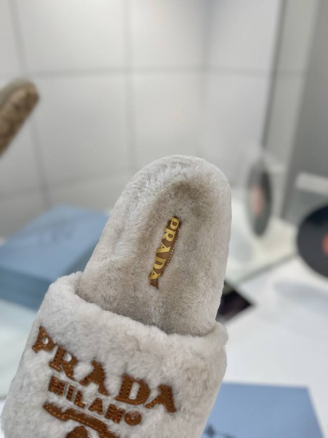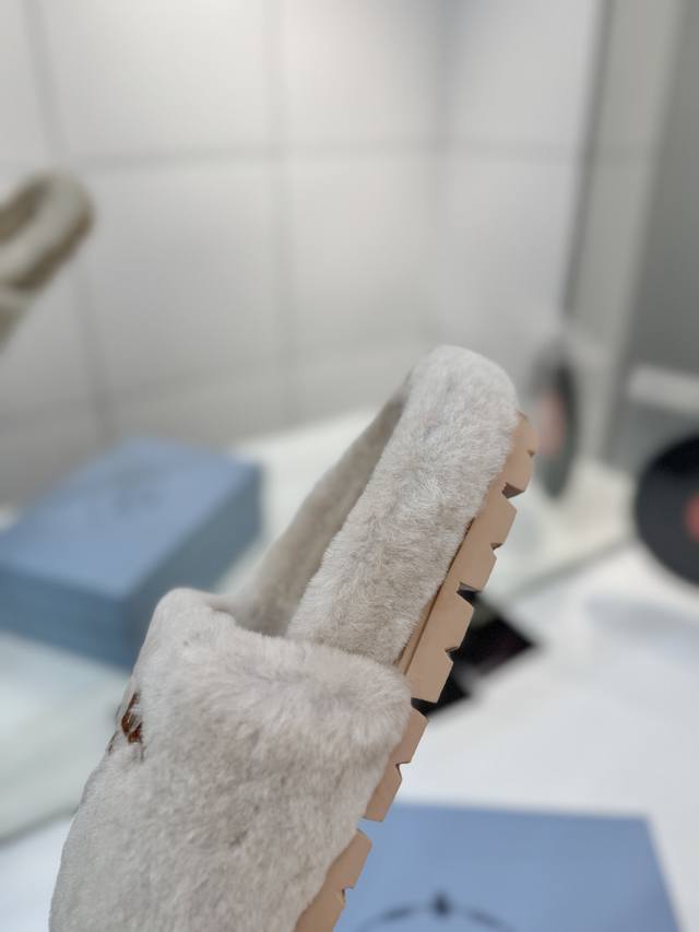 出厂价P 普拉达秋冬新款毛拖,毛毛鞋,可外穿 不管居家还是外穿都是品味的象征性! 秋冬搭配袜子 那更是太绝太绝了 鞋面:进口澳洲真羊毛 手感细腻柔软丝滑 大底: