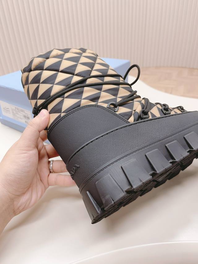 出厂价pp: DDD 最新款普拉达:雪地靴 DDD 涂珐琅三角形金属徽标 DDD 靴筒:14厘米 DDD 厚底,50毫米 DDD 凹凸纹1:1原版大底 DDD 凹口沿条 DDD 颜色:3 DDD 码数:35-42 41.42定做 DDD