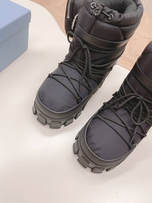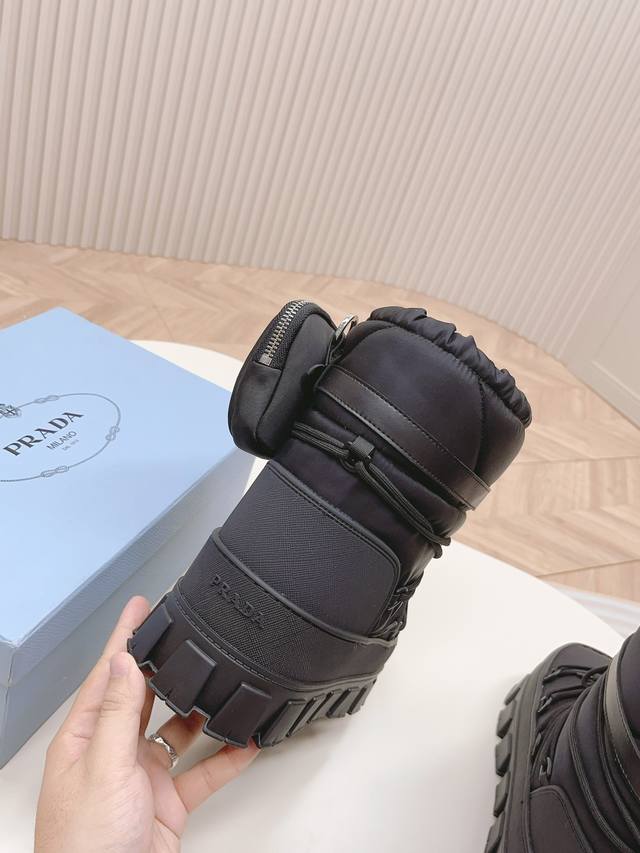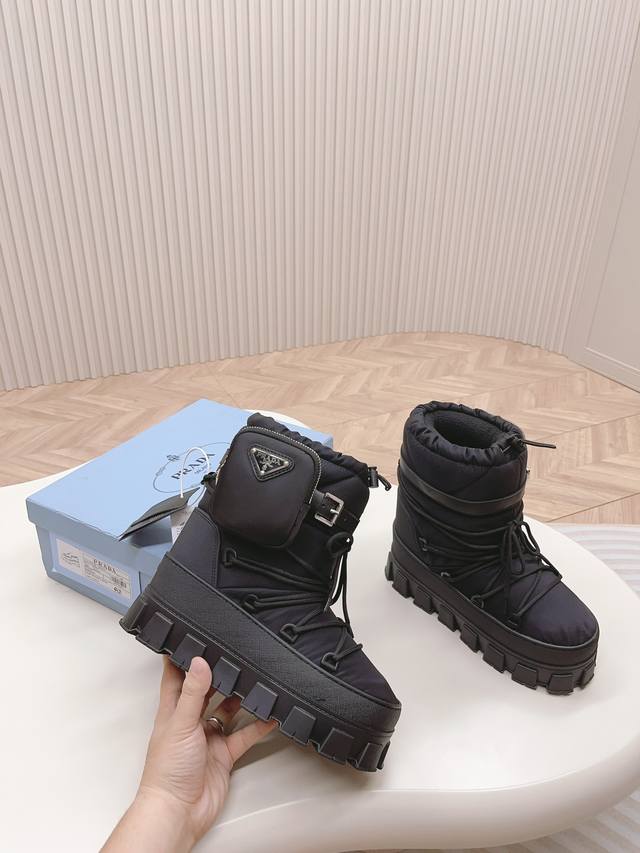 出厂价pp: DDD 最新款普拉达:雪地靴 DDD 涂珐琅三角形金属徽标 DDD 靴筒:14厘米 DDD 厚底,50毫米 DDD 凹凸纹1:1原版大底 DDD 凹口沿条 DDD 颜色:4 DDD 码数:35-42 41.42定做 DDD