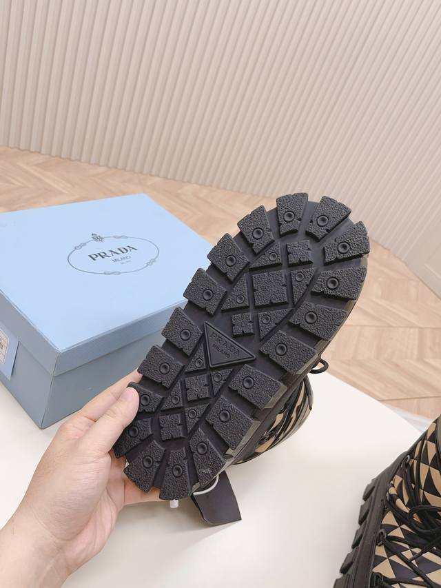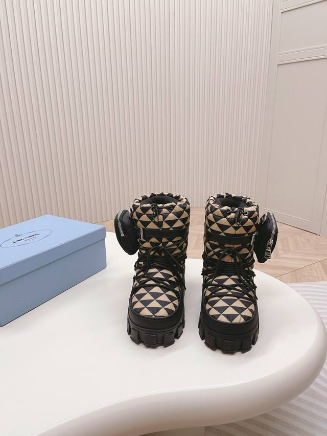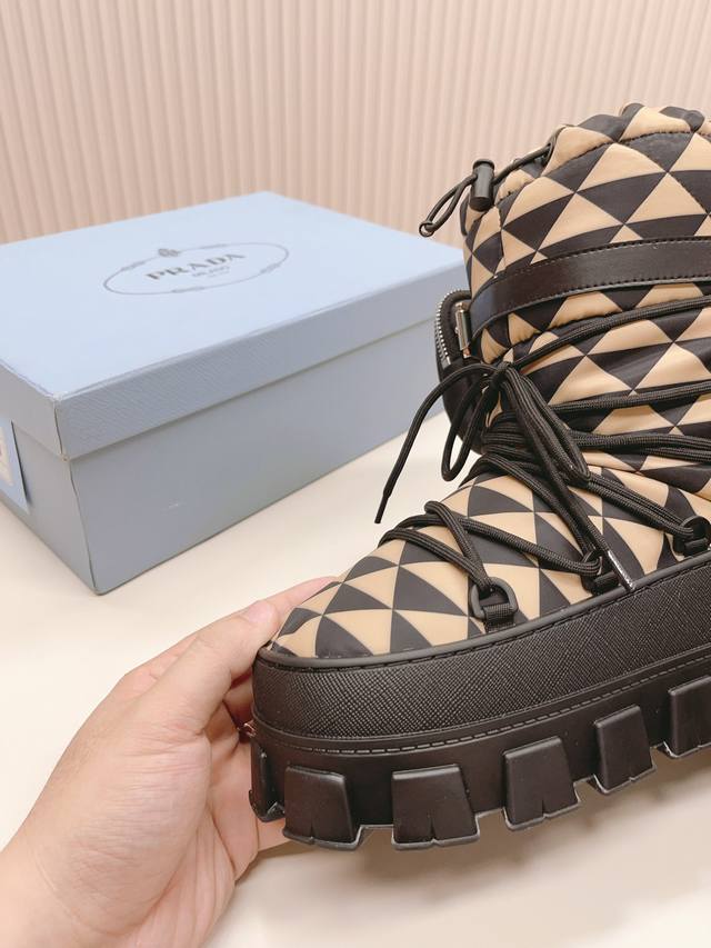 出厂价pp: DDD 最新款普拉达:雪地靴 DDD 涂珐琅三角形金属徽标 DDD 靴筒:14厘米 DDD 厚底,50毫米 DDD 凹凸纹1:1原版大底 DDD 凹口沿条 DDD 颜色:4 DDD 码数:35-42 41.42定做 DDD