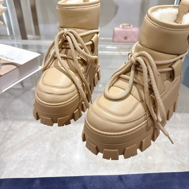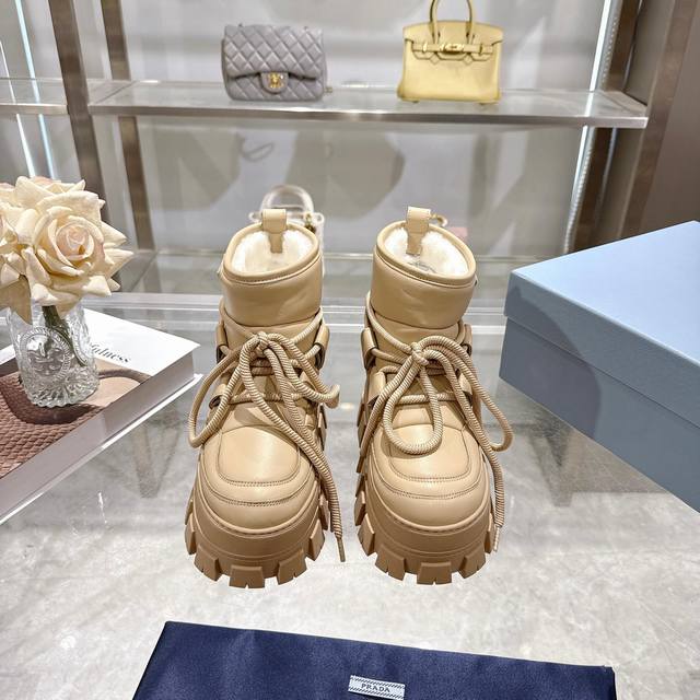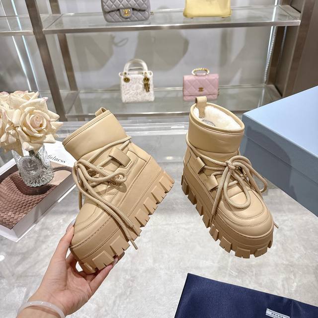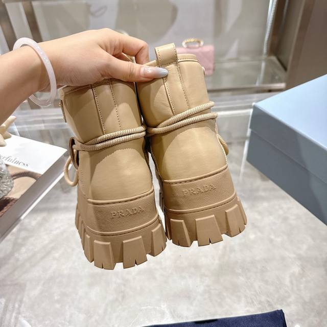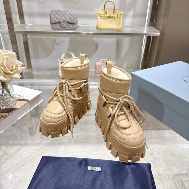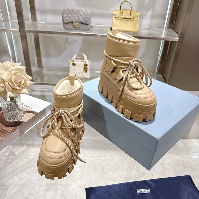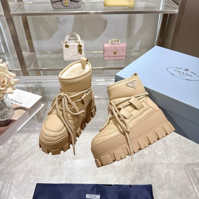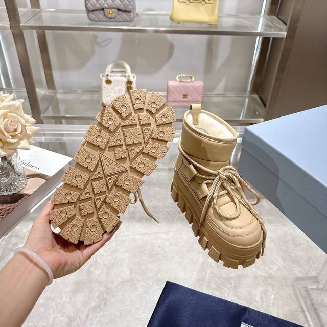 出厂价pp: DDD 最新款普拉达:雪地靴 DDD 涂珐琅三角形金属徽标 DDD 靴筒:14厘米 DDD 厚底,50毫米 DDD 凹凸纹1:1原版大底 DDD 凹口沿条 DDD 颜色:4 DDD 码数:35-42 41.42定做 DDD
