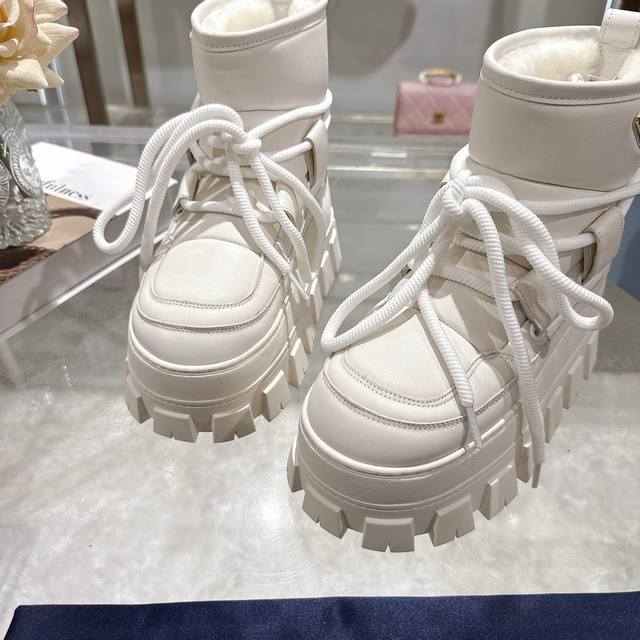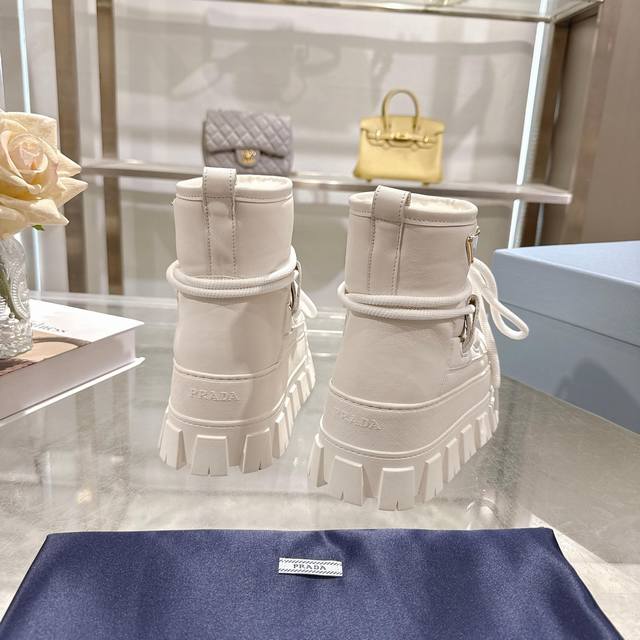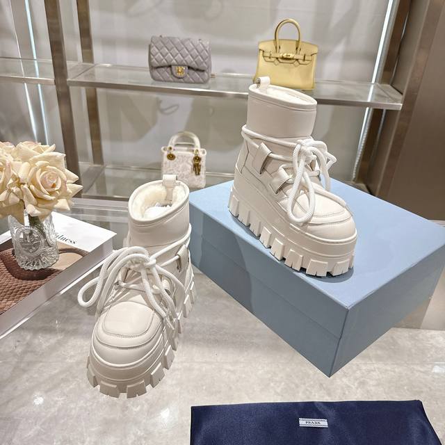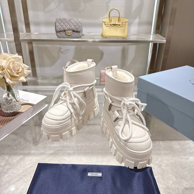 出厂价pp: DDD 最新款普拉达:雪地靴 DDD 涂珐琅三角形金属徽标 DDD 靴筒:14厘米 DDD 厚底,50毫米 DDD 凹凸纹1:1原版大底 DDD 凹口沿条 DDD 颜色:4 DDD 码数:35-42 41.42定做 DDD