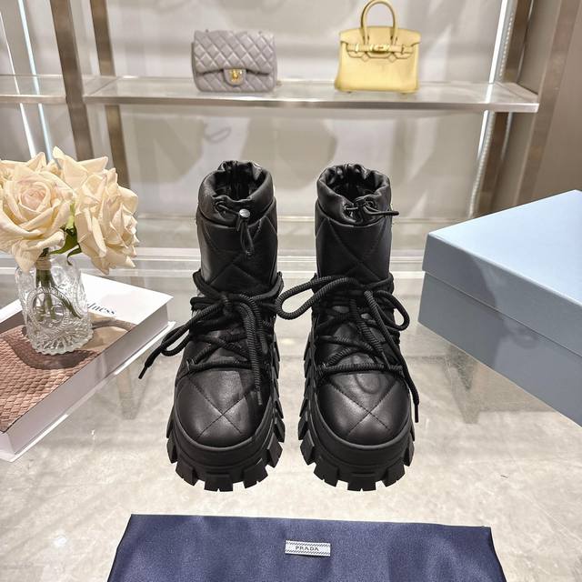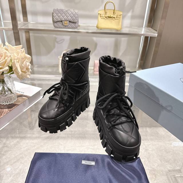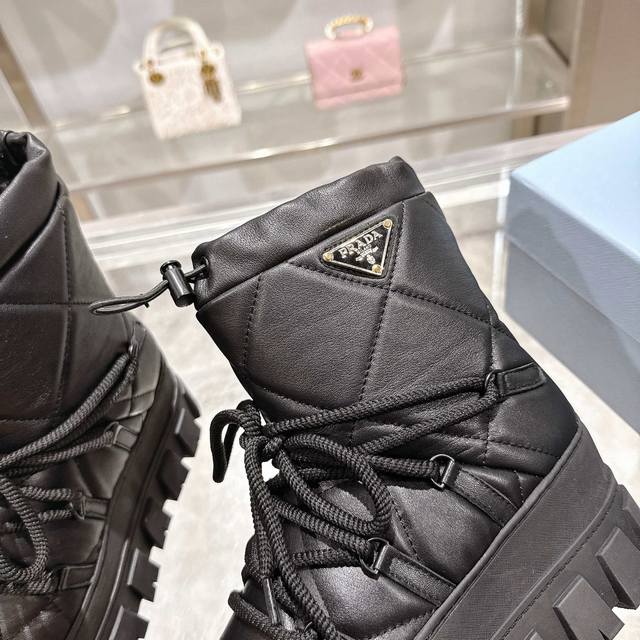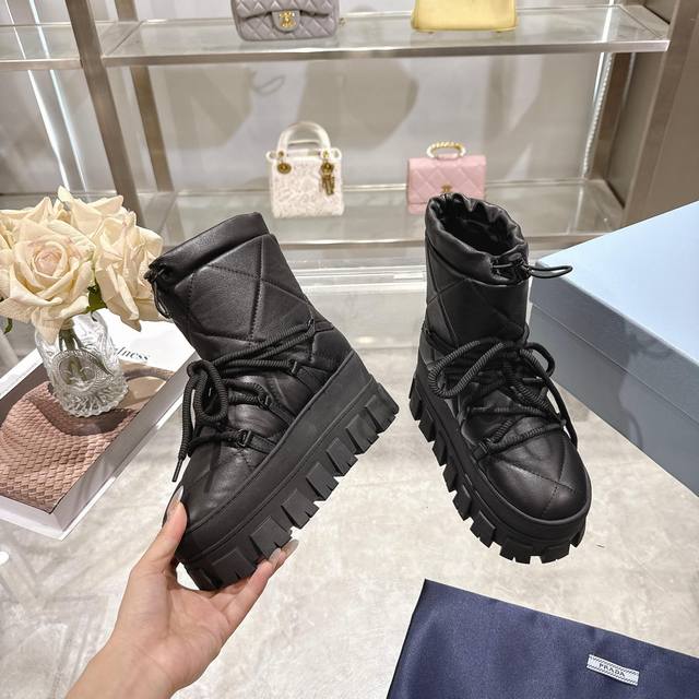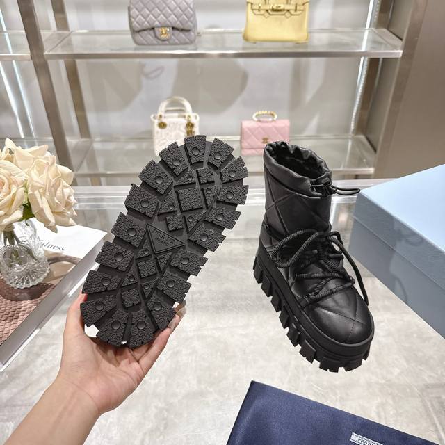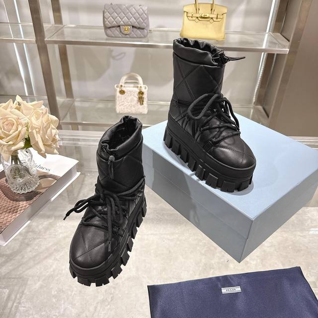 出厂价pp: DDD 最新款普拉达:雪地靴 DDD 涂珐琅三角形金属徽标 DDD 靴筒:14厘米 DDD 厚底,50毫米 DDD 凹凸纹1:1原版大底 DDD 凹口沿条 DDD 颜色:4 DDD 码数:35-42 41.42定做 DDD