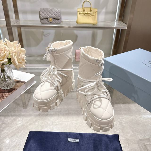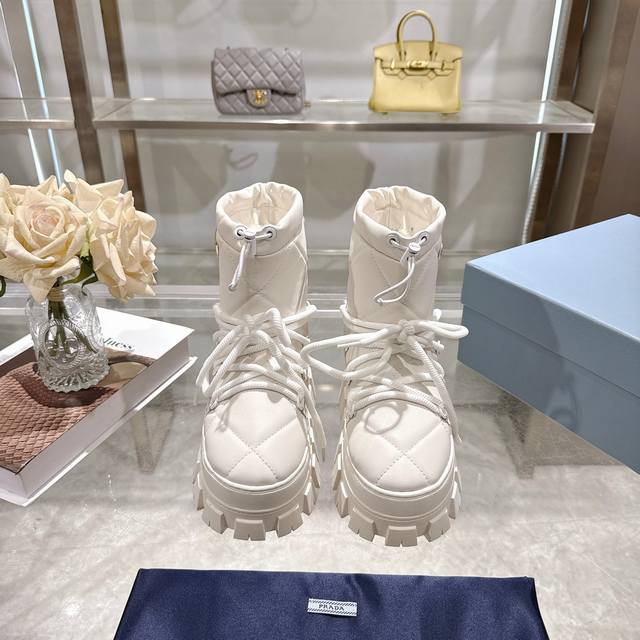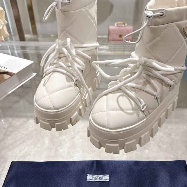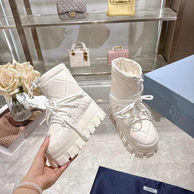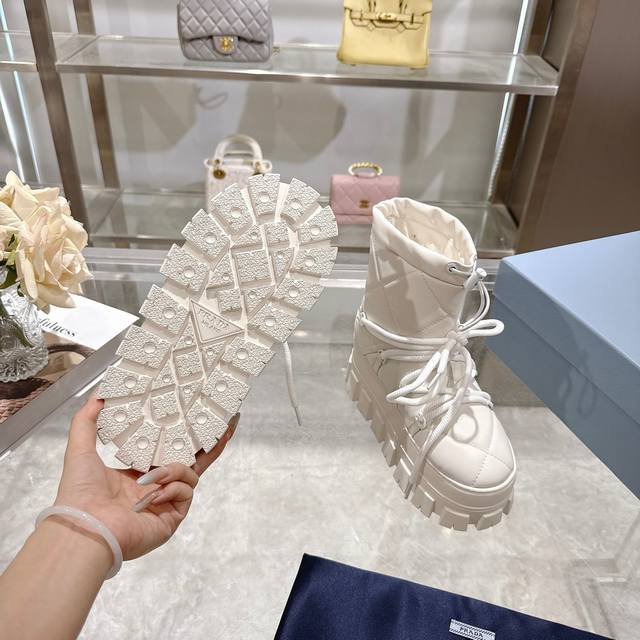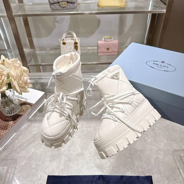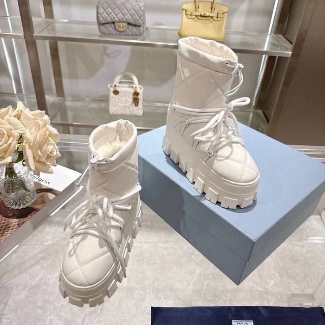 出厂价pp: DDD 最新款普拉达:雪地靴 DDD 涂珐琅三角形金属徽标 DDD 靴筒:14厘米 DDD 厚底,50毫米 DDD 凹凸纹1:1原版大底 DDD 凹口沿条 DDD 颜色:4 DDD 码数:35-42 41.42定做 DDD