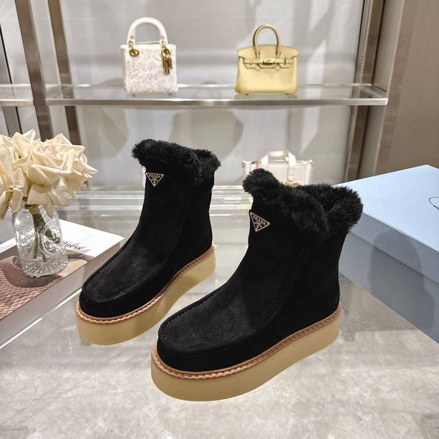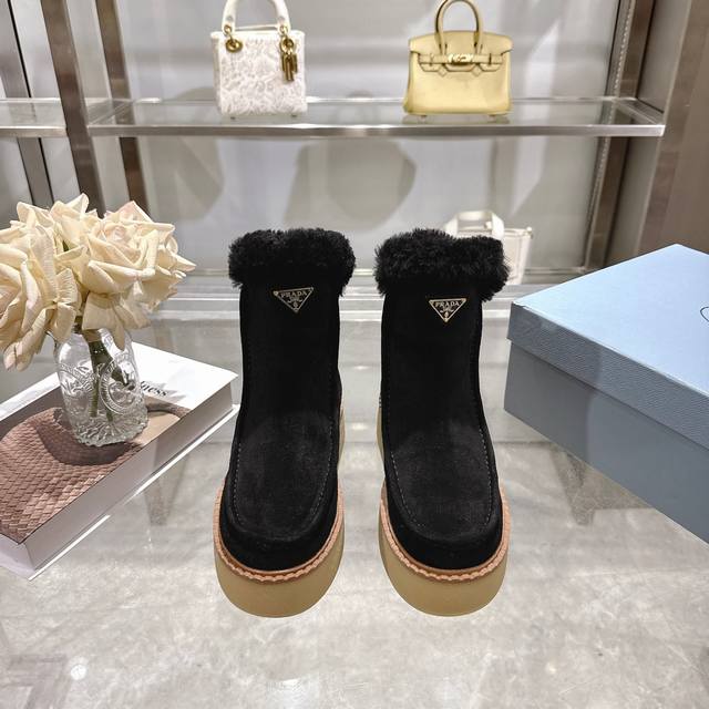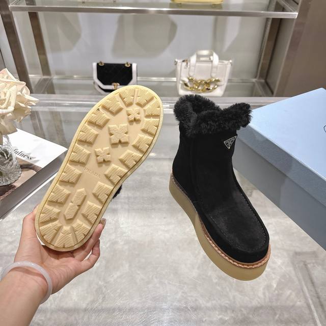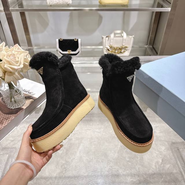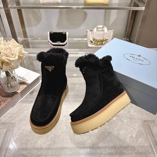 出厂价pp: DDD 最新款普拉达:雪地靴 DDD 涂珐琅三角形金属徽标 DDD 靴筒:14厘米 DDD 厚底,50毫米 DDD 凹凸纹1:1原版大底 DDD 凹口沿条 DDD 颜色:5 DDD 码数:35-42 41.42定做 DDD