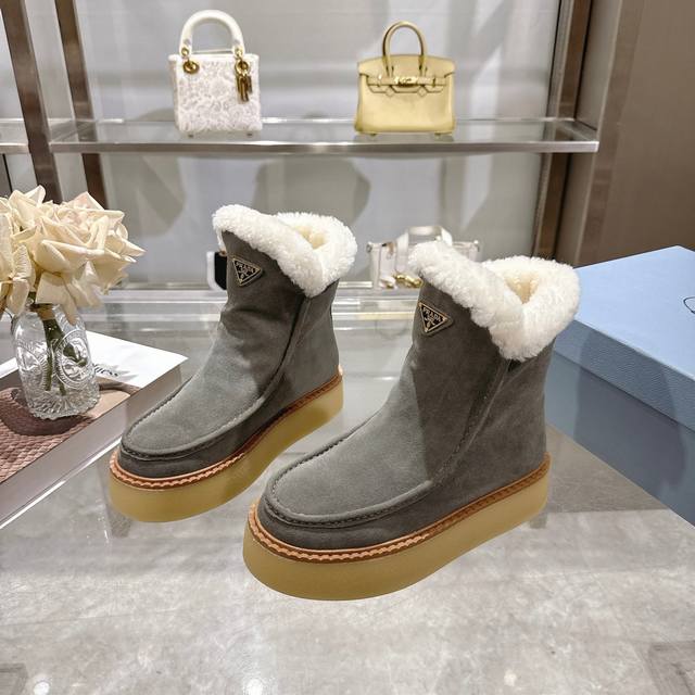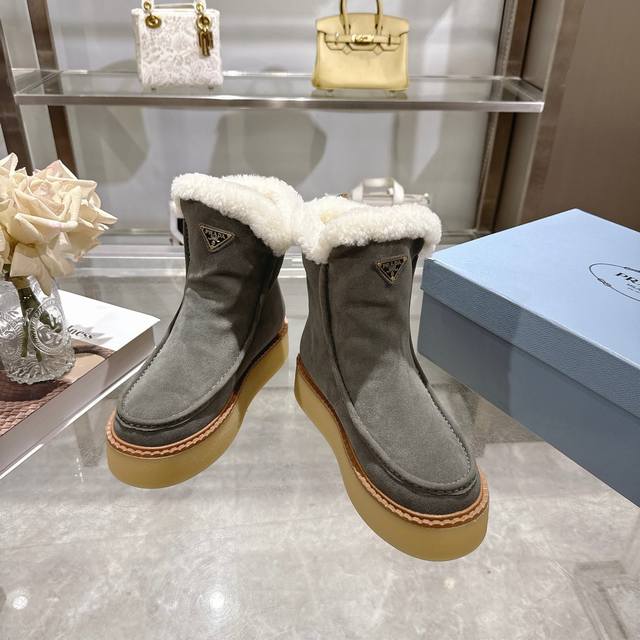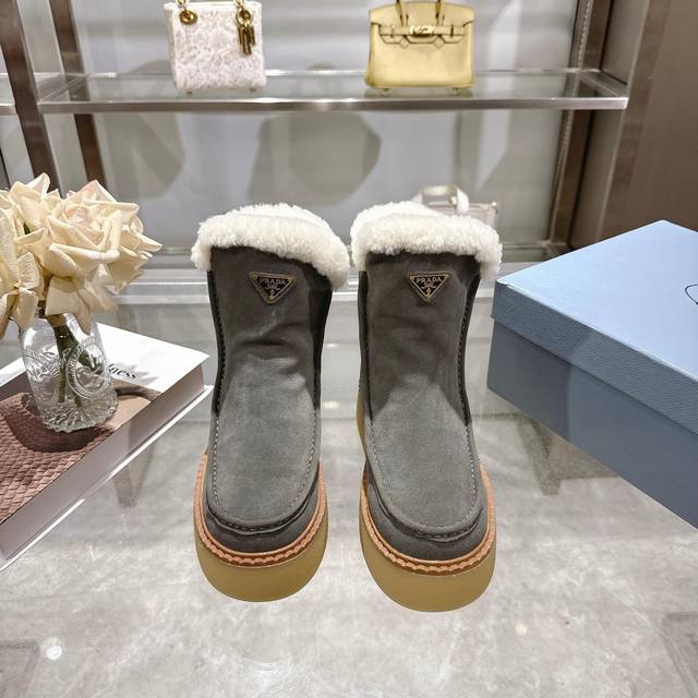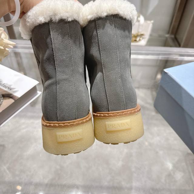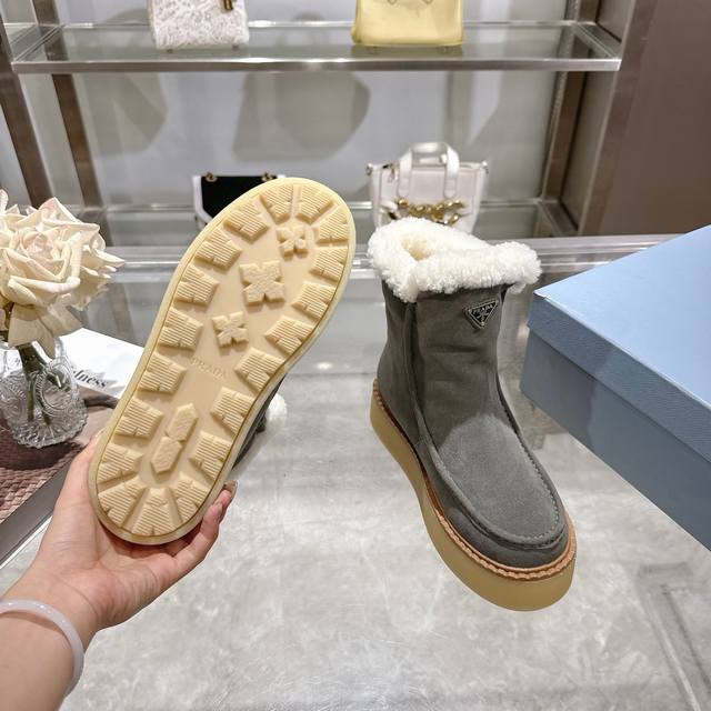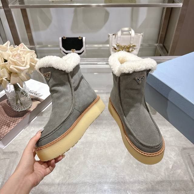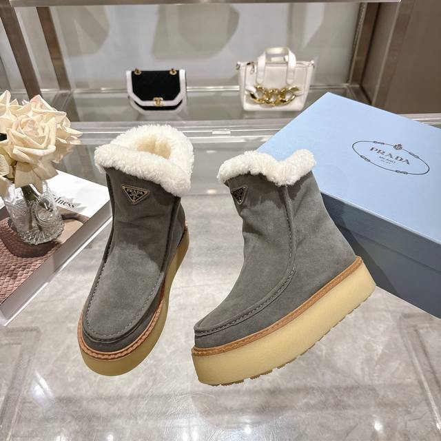 / 出厂价pp: 最新款普拉达:雪地靴 涂珐琅三角形金属徽标 靴筒:14厘米 厚底,50毫米 凹凸纹1:1原版大底 凹口沿条 颜色:5 码数:35-42 41.42