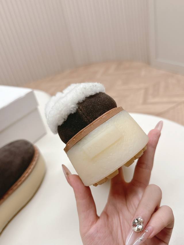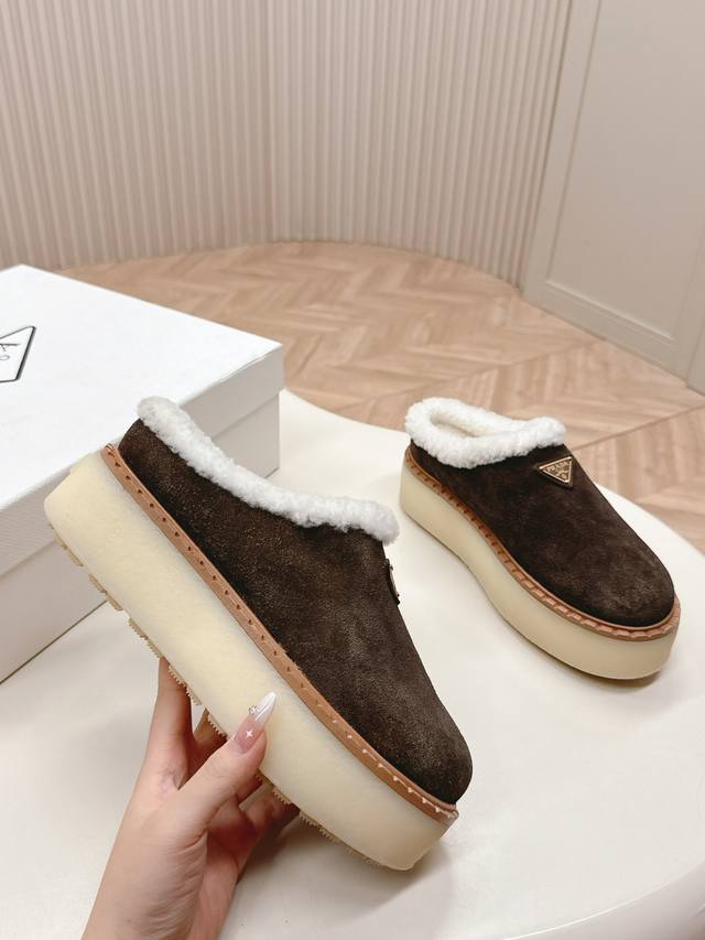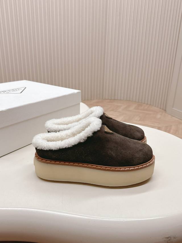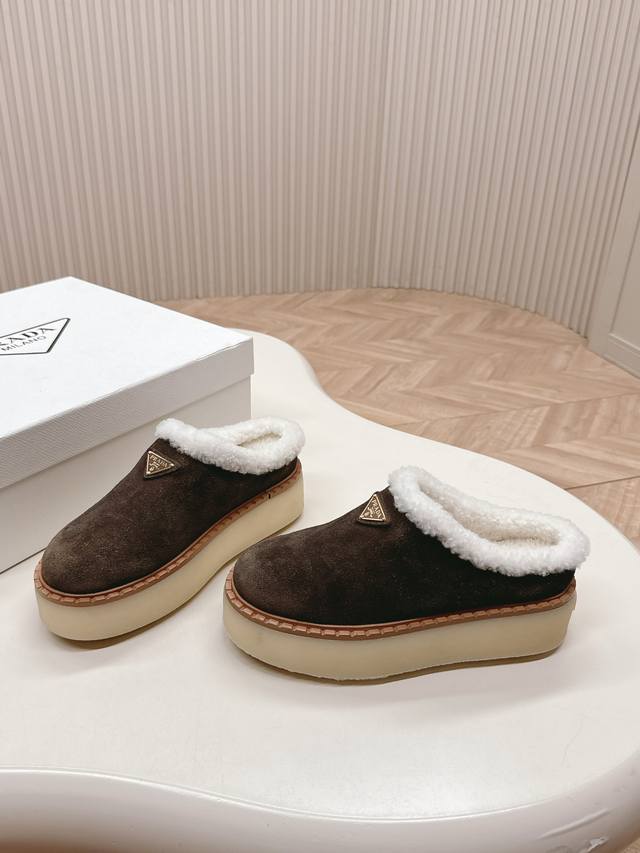 / 出厂价pp: 高版prada 普拉达 秋冬季新款毛毛厚底拖鞋 三角扣面包包头半拖鞋 全真皮沿条 鞋面:原版定制牛猄 内里: 糕羊毛 大底:原版开模防滑大底 鞋码