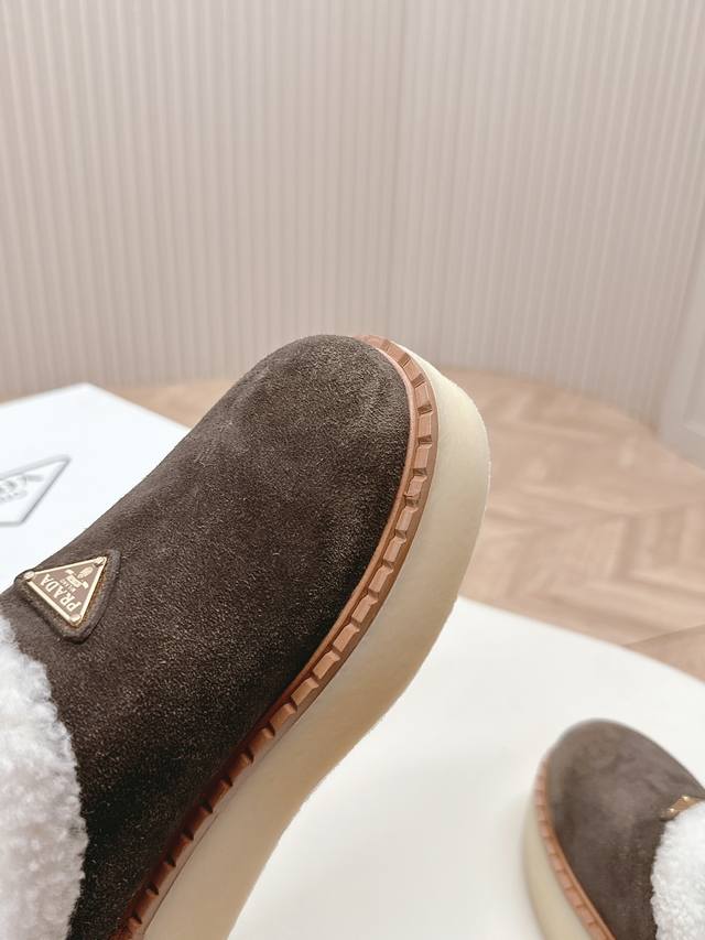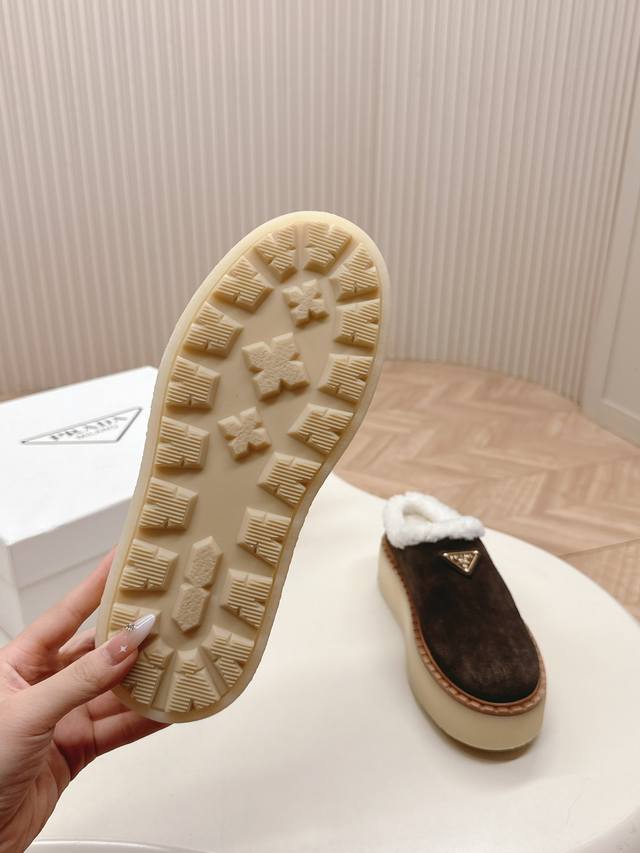 出厂价pp: 高版prada 普拉达 秋冬季新款毛毛厚底拖鞋 三角扣面包包头半拖鞋 全真皮沿条 鞋面:原版定制牛猄 内里: 糕羊毛 大底:原版开模防滑大底 鞋码