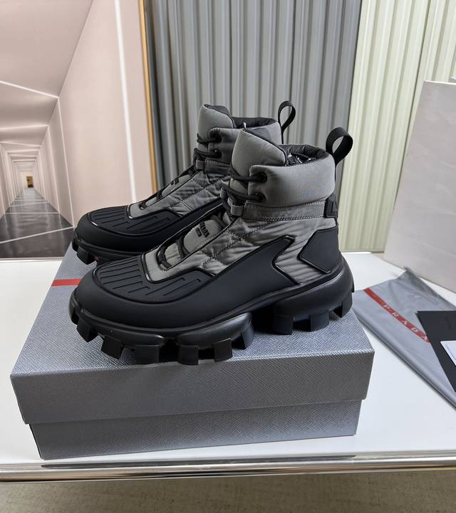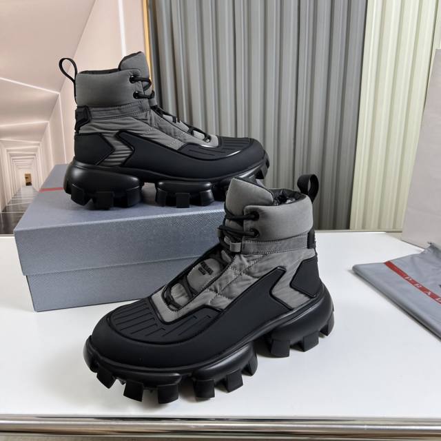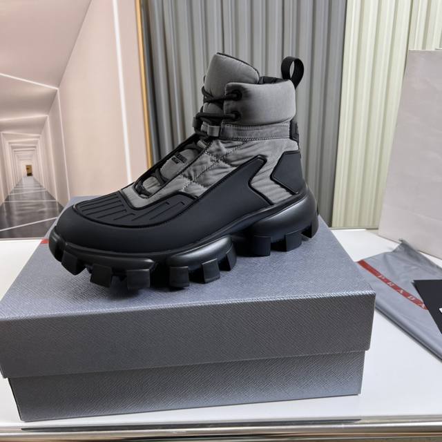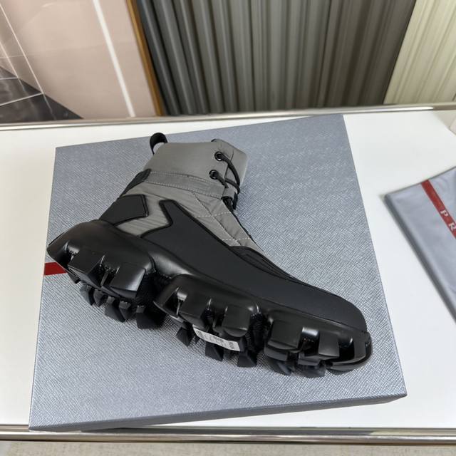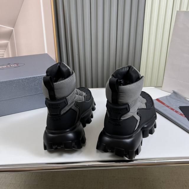 出厂价pp: 最新款普拉达:雪地靴 涂珐琅三角形金属徽标 靴筒:14厘米 厚底,50毫米 凹凸纹1:1原版大底 凹口沿条 颜色:5...