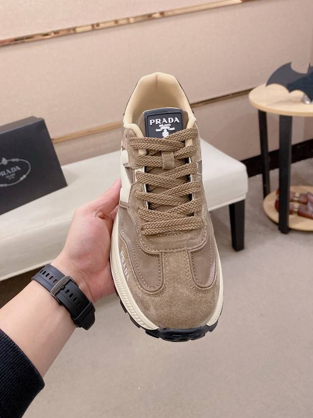 工厂P价 新款Prada 普拉达 专柜同步上市, 新款男鞋、面料精选牛皮。内里:网布内里。高端气垫开模防滑橡胶大底,精美线条、简约大气,上脚舒服上挡次、休闲旅游