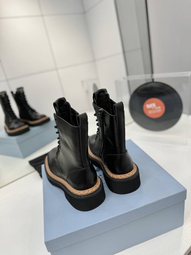 工厂P价 普拉达三角标双沿条锯齿厚底系带及踝靴侧拉链马丁靴机车风短靴 这款皮革短靴融入三角标细节,风格百搭,橡胶鞋底坚实而轻盈,彰显运动风尚与实用性。惯用于精美鞋履的复古皮革经Prad*系列重释,打造别具现代气息的混搭设计。 鞋面:开边珠牛皮 牛皮 高丝光牛反绒 内里:羊皮 跟高:4.5Cm 大底:双沿条锯齿橡胶发泡底 码数:35-41 40.41定做不退换