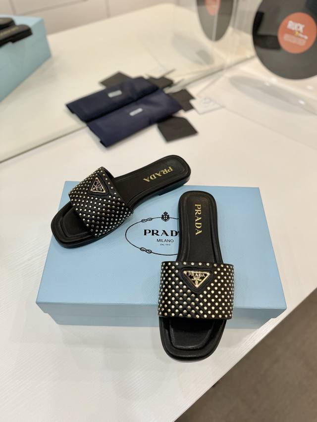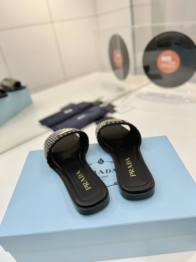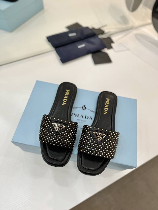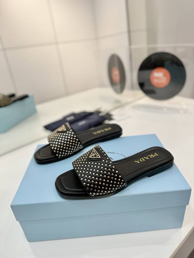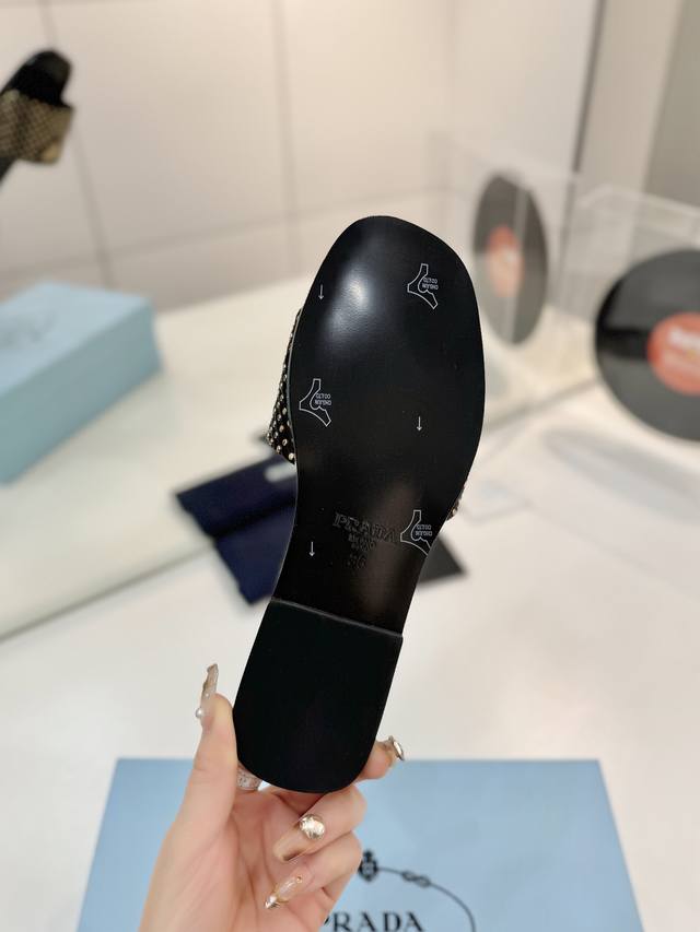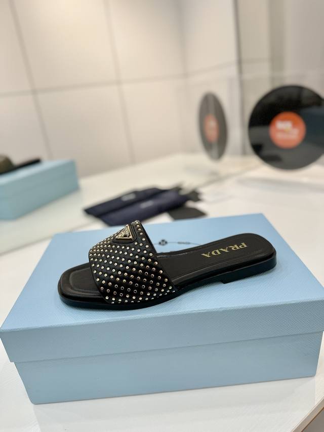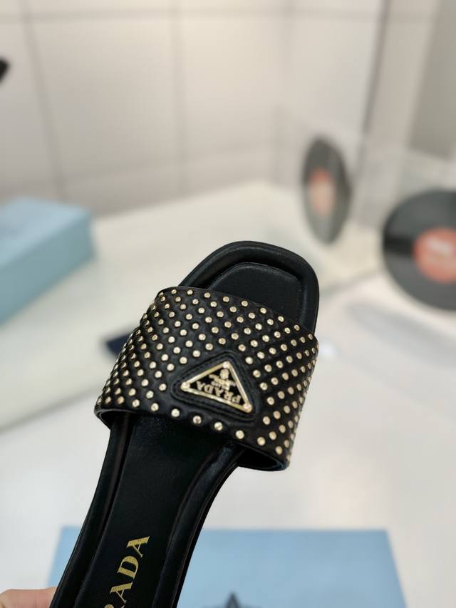 工厂P价 普拉达编制拖鞋 新款春夏现代风格的线条和原始的建筑体量定义了这些具有复杂魅力 Prada三角形的标志性几何形状为鞋跟设计带来灵感,以独特的现代触感,突显锥形和柔美曲线。 鞋面:原版牛皮打钉鞋面 内里 :内里,垫脚牛皮 大底:意大利真皮大底 码数:35-42 40.41.42订制