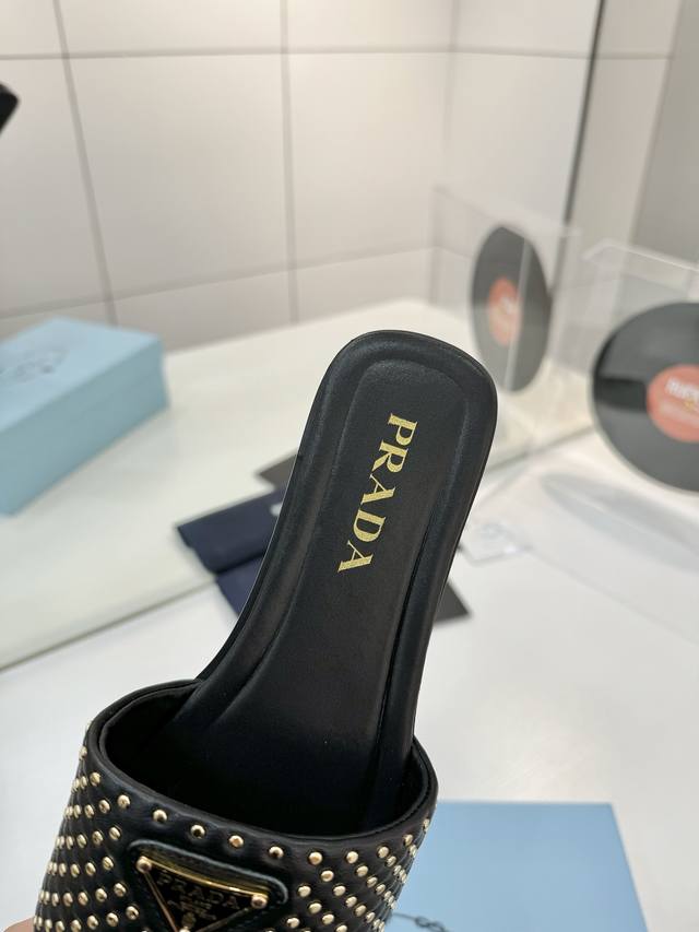 工厂P价 普拉达编制拖鞋 新款春夏现代风格的线条和原始的建筑体量定义了这些具有复杂魅力 Prada三角形的标志性几何形状为鞋跟设计带来灵感,以独特的现代触感,突