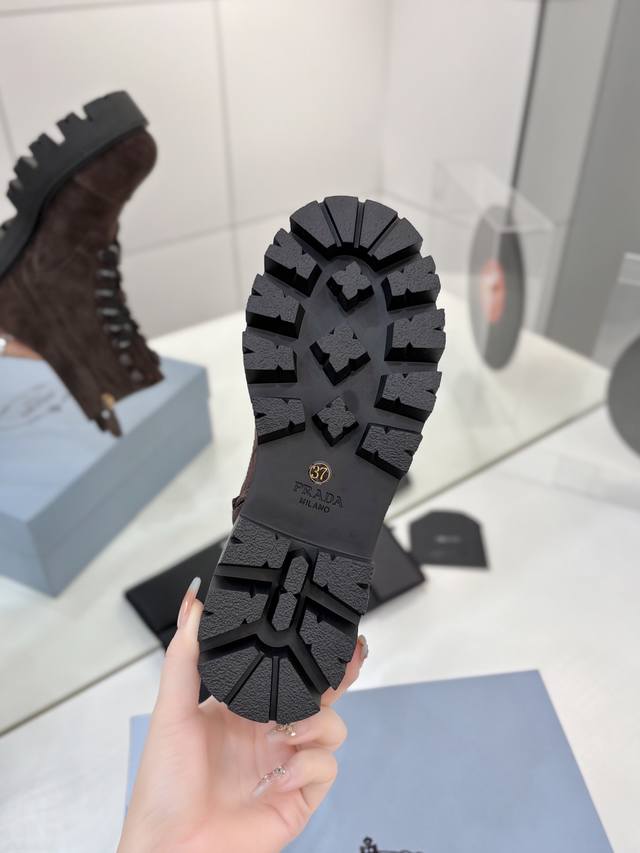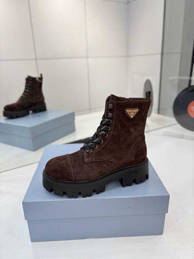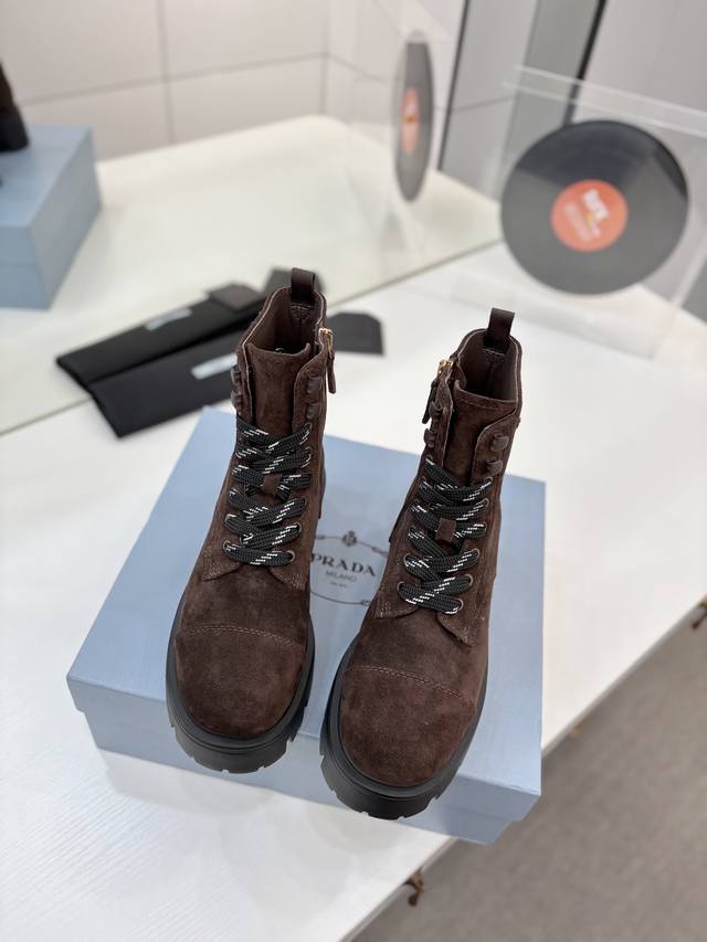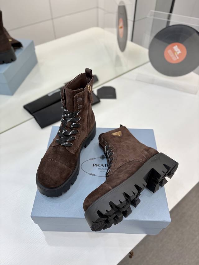/ 工厂p价 普拉达马丁靴, 牛反绒马丁靴卡其灰色,系带设计配黑白格纹鞋带,人人都爱也轻松驾驭!!每年都会爆.还有就是百搭经典的鞋楦,足以征服你,穿上它,增高休闲两
