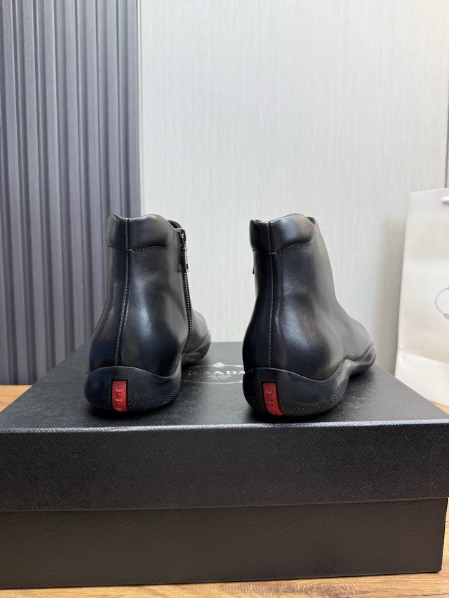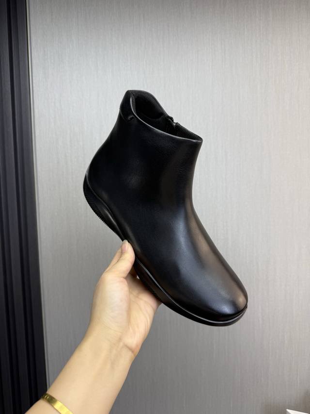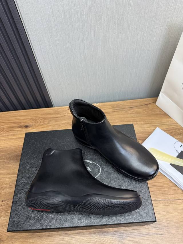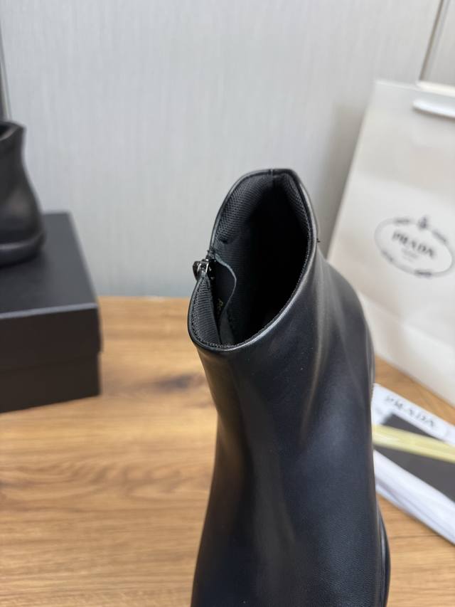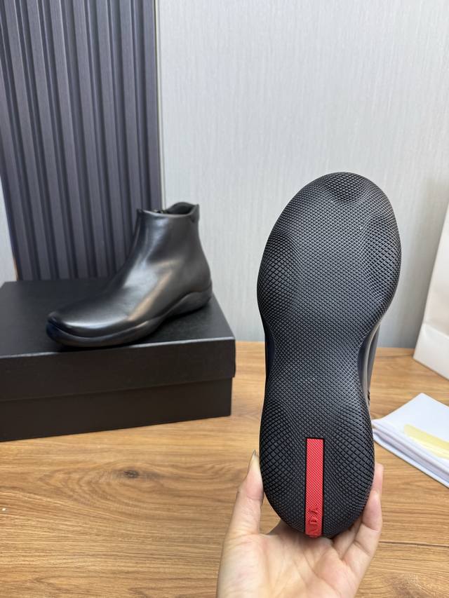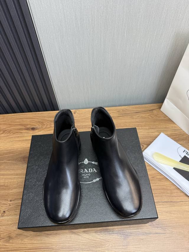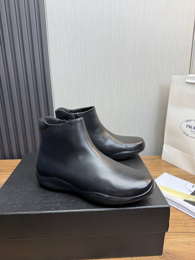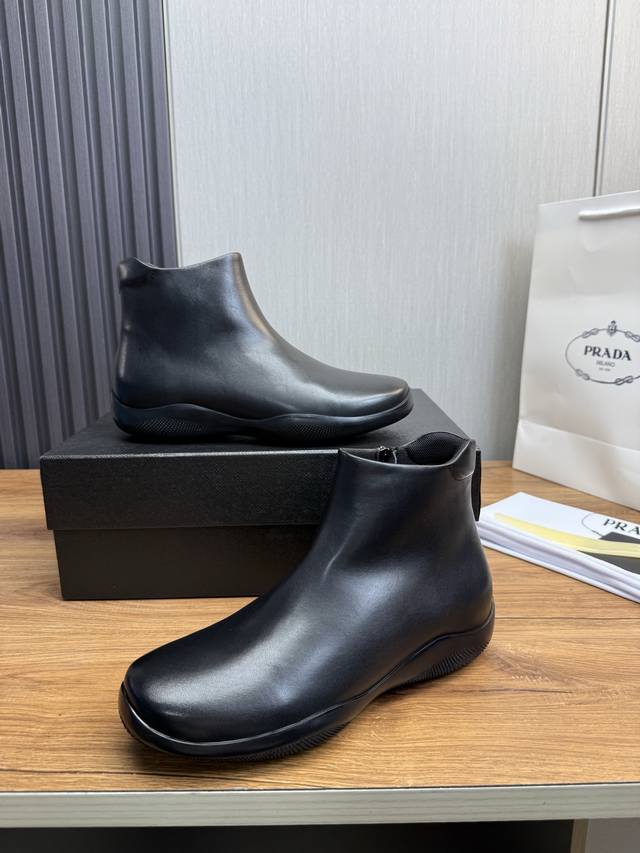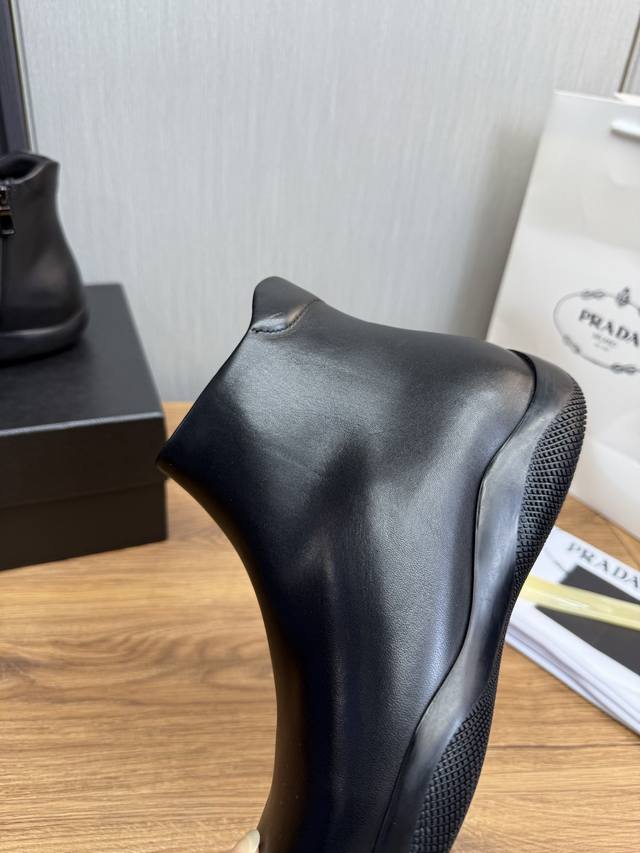 工厂p价 皮里 prad* 普拉达 男士中邦踝靴 套穿式设计短靴 莞产顶级猛货 这款皮靴采用进口牛皮 开边珠亮皮制成 款式简约新颖 皮质柔软光泽透亮 柔软舒适