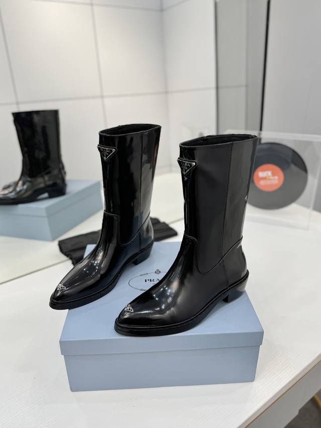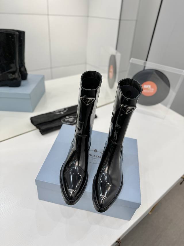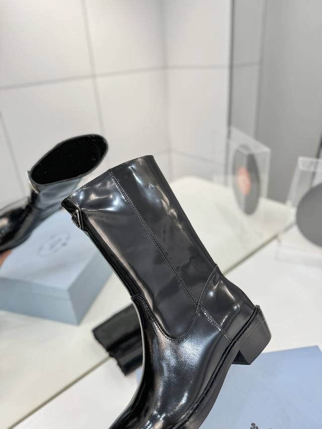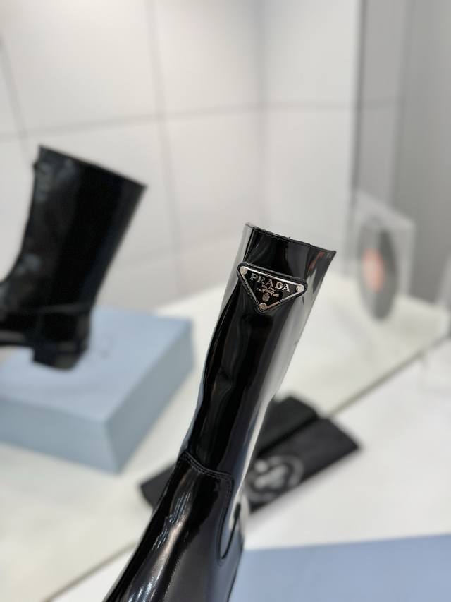 工厂p价 秋冬新款prada普拉达尖头三角标直筒骑士靴马丁靴 这款皮革靴撷取简约美学风格,诠释当代设计精髓,塑就丰盈立体的廓形。流畅构型与金属刻字徽标彰显鲜明个