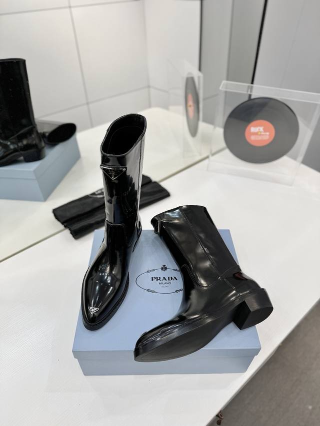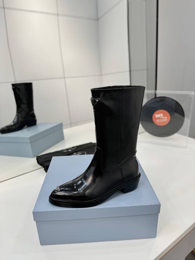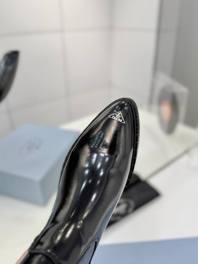 / 工厂p价 秋冬新款prada普拉达尖头三角标直筒骑士靴马丁靴 这款皮革靴撷取简约美学风格,诠释当代设计精髓,塑就丰盈立体的廓形。流畅构型与金属刻字徽标彰显鲜明个