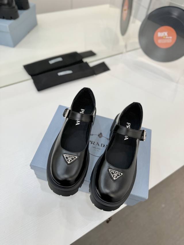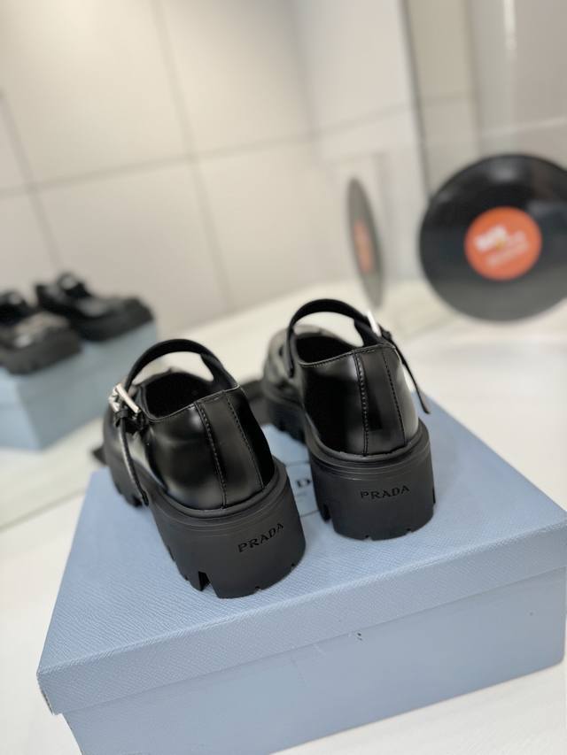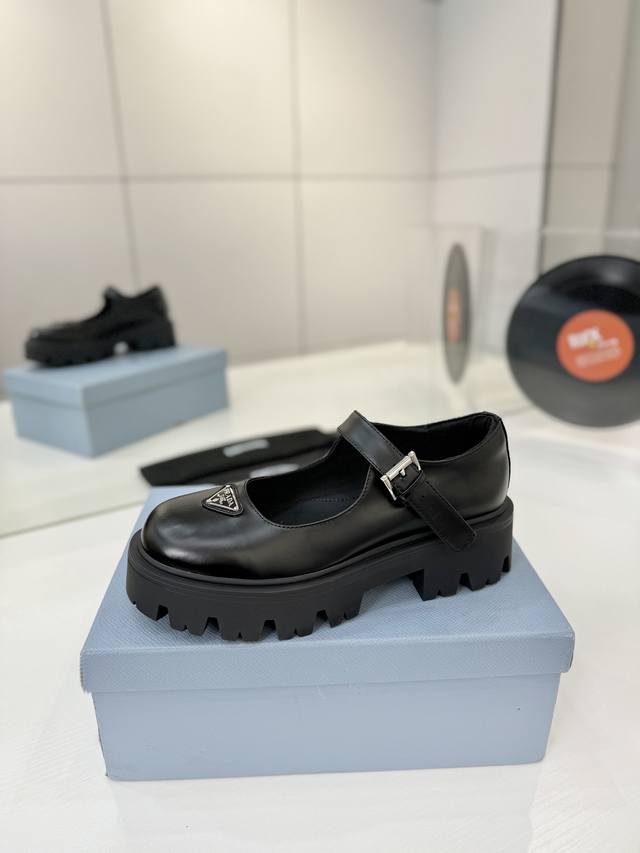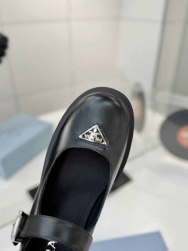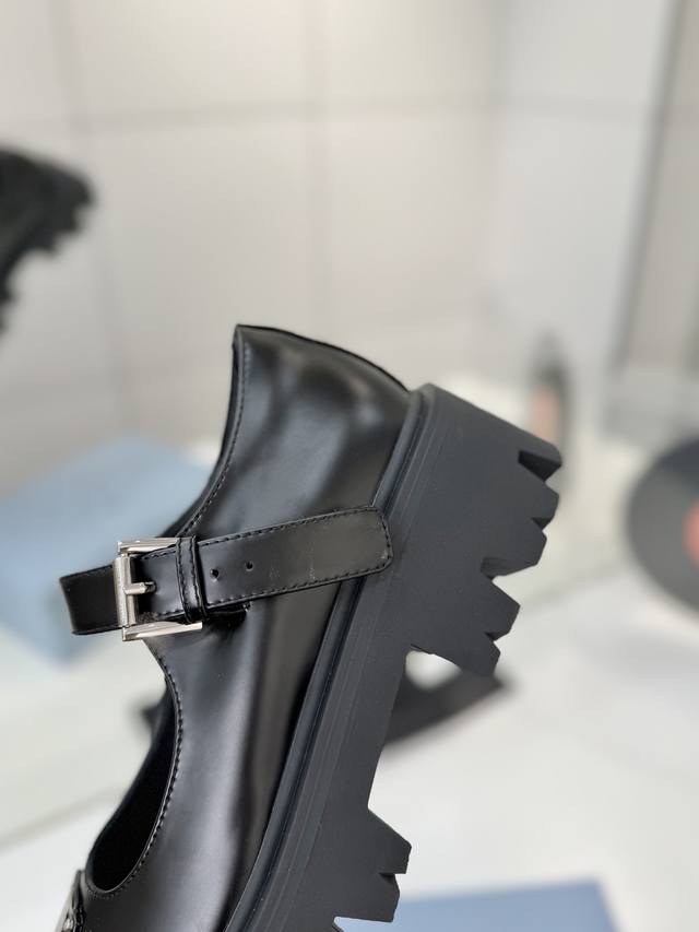 工厂P价 Prada玛丽珍鞋 三角扣厚底小皮鞋乐福鞋,全套齐 这款鞋鞋面配有饰带和金属搭扣 涂珐琅金属三角形徽标,复古时髦前卫的轮齿厚底鞋底搭配牛皮鞋面让整双鞋