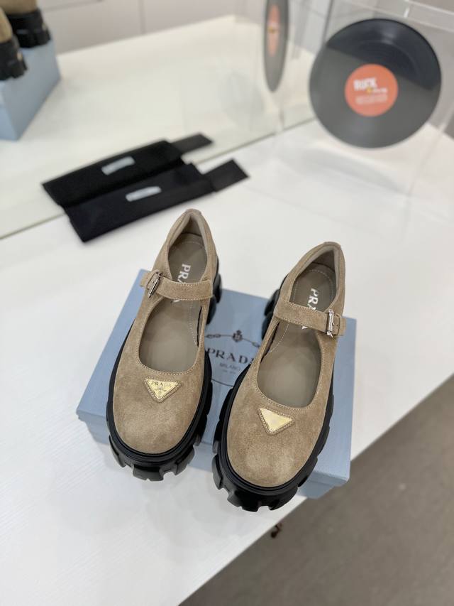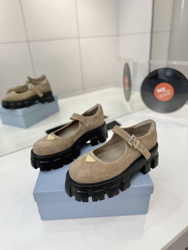 / 工厂P价 Prada玛丽珍鞋 三角扣厚底小皮鞋乐福鞋,全套齐 这款鞋鞋面配有饰带和金属搭扣 涂珐琅金属三角形徽标,复古时髦前卫的轮齿厚底鞋底搭配牛皮鞋面让整双鞋
