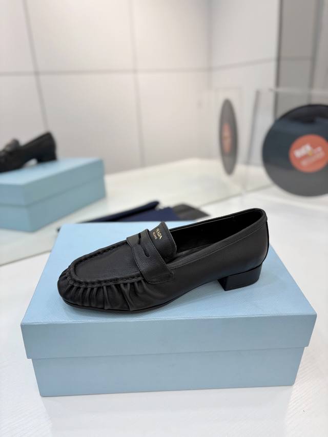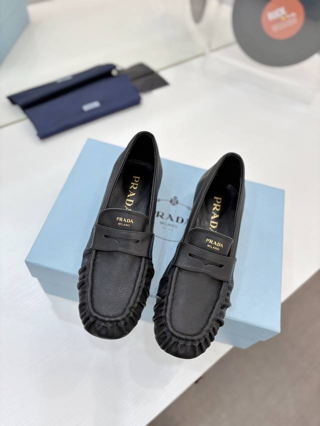 / 工厂P价 Prada褶皱单鞋 DDD 选用柔软麂皮,质感细腻又高级。经典一脚蹬设计,搭配品牌金属Logo,低调奢华。平底结构,日常通勤或休闲都很舒适,复古百搭,