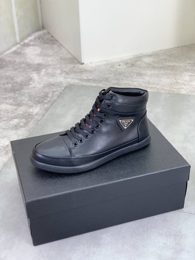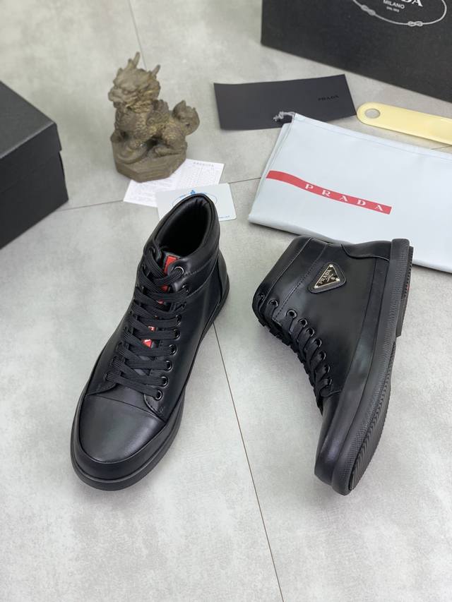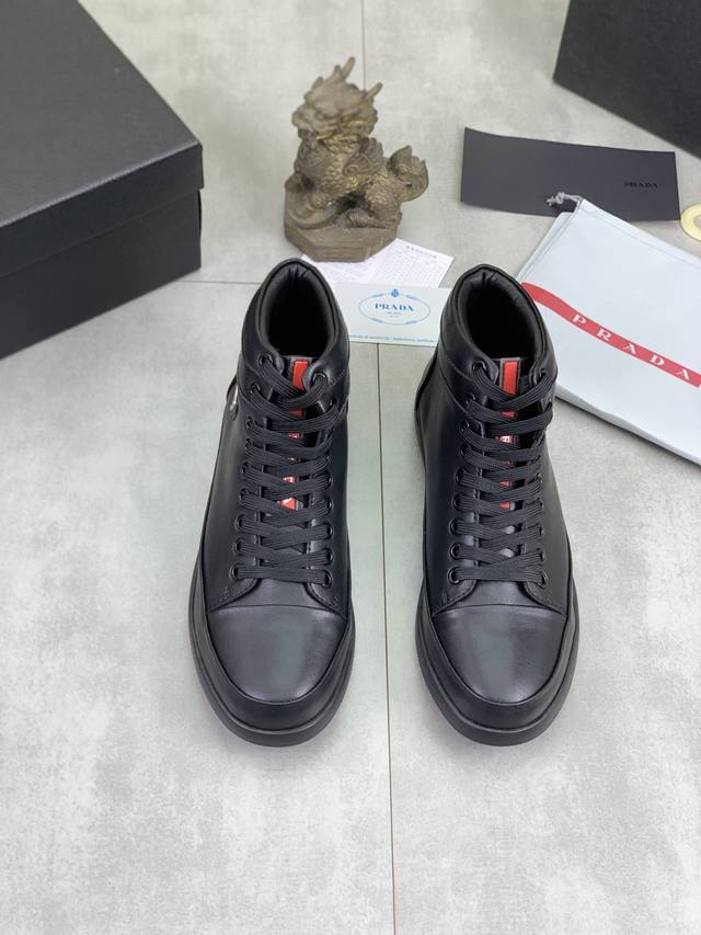 工厂P价P 实价 新款Prada 普拉达 高帮同步经典款上市, 新款男鞋、面料精选原版进口小牛皮。头层进口猪皮内里。原版牛里垫脚!原版开模防滑Pu大底,精美线条