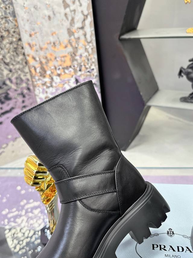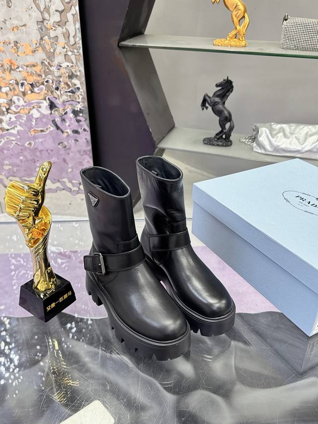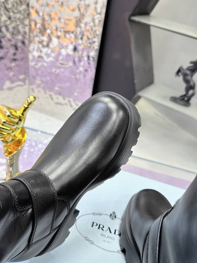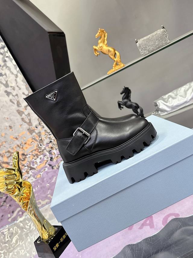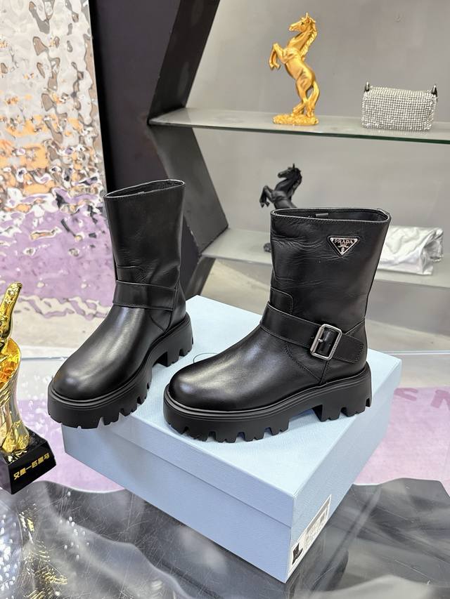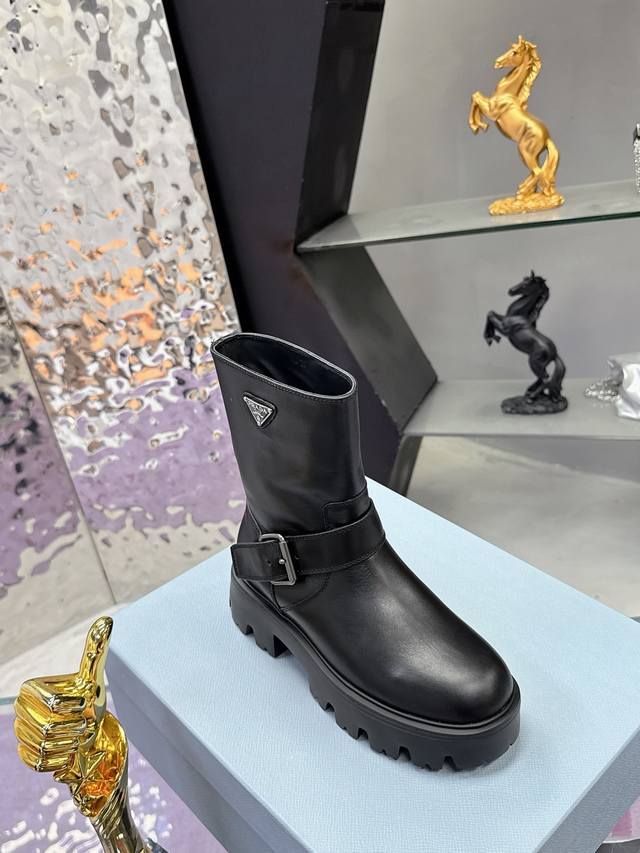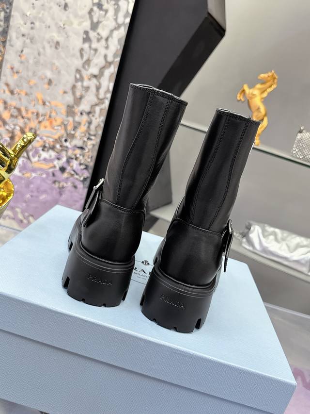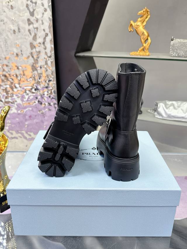 工厂P价P: Prada 普拉达经典三角标一脚蹬王炸女靴 短靴 冬天买不到的系列,绝对是今年的大爆款!!贼好看!Prada靴子真的很哇塞!上脚大气显腿瘦气质这块刚好拿捏 全系列采用多种进口材料 进口高丝光牛皮,牛皮 ,内里丝绸牛皮里 大底:橡胶发泡底,轻便舒适! Size:35-40 41 订做不退换