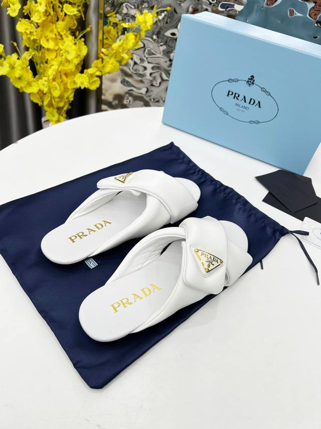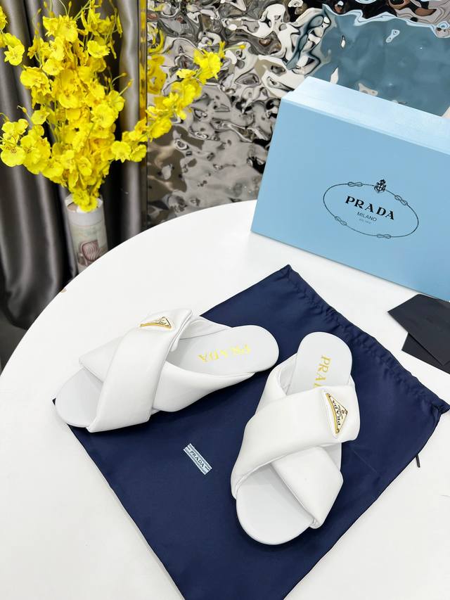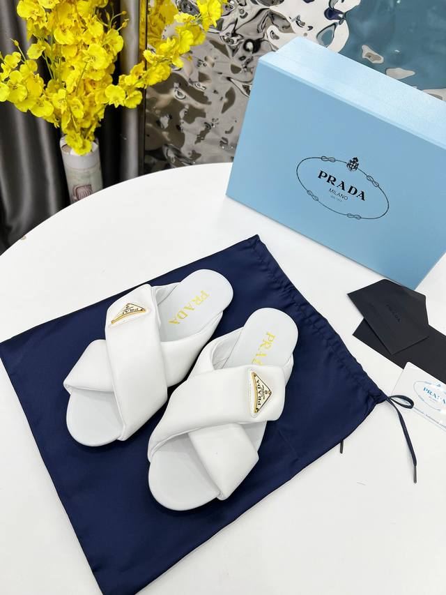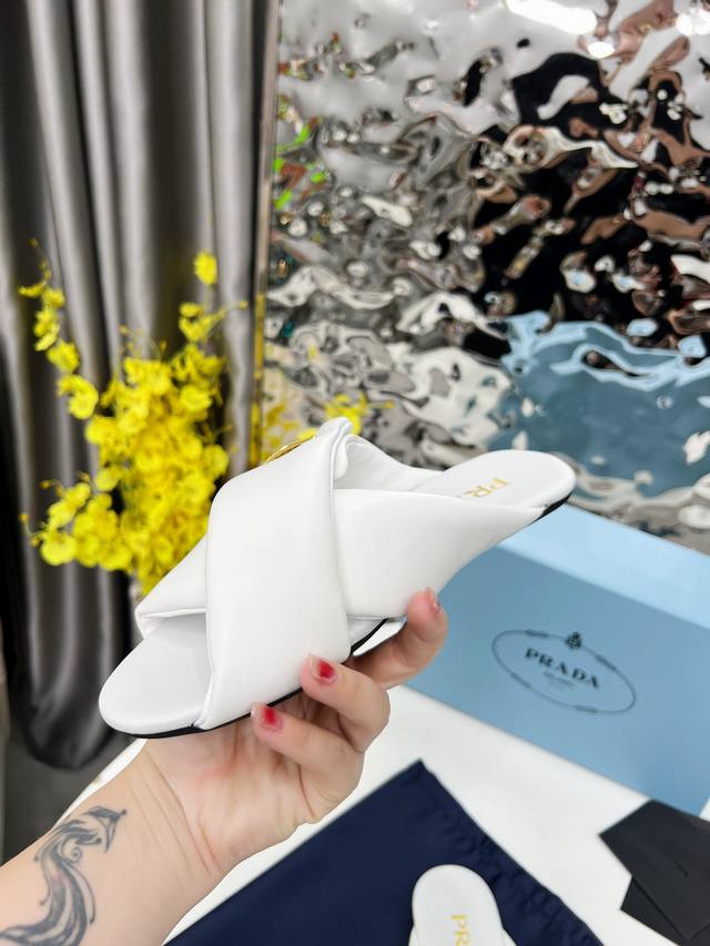 / 普拉达面包拖顶级新款2025穆勒鞋穿起来特别方便,出门换鞋不用弯腰不用系鞋带,穿上就走,春夏秋三季可穿。这双穆勒鞋是橡胶发泡底,很轻便,Prada标志性的珐琅三