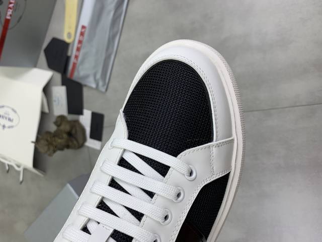 官网1.1 Prada 普拉达男士系带皮革休闲运动鞋,鞋面牛皮拼接透气网面打造 柔软舒适透气 鞋舌装饰prada品牌字母标识...