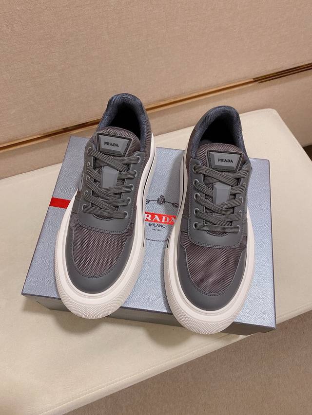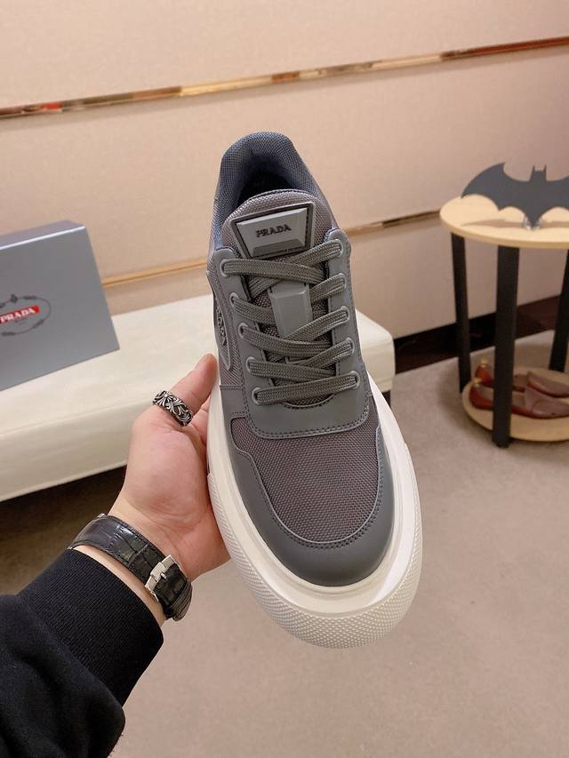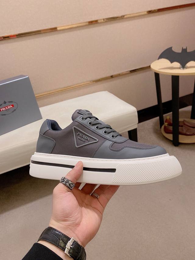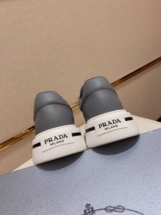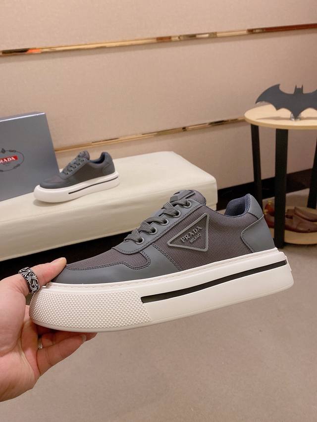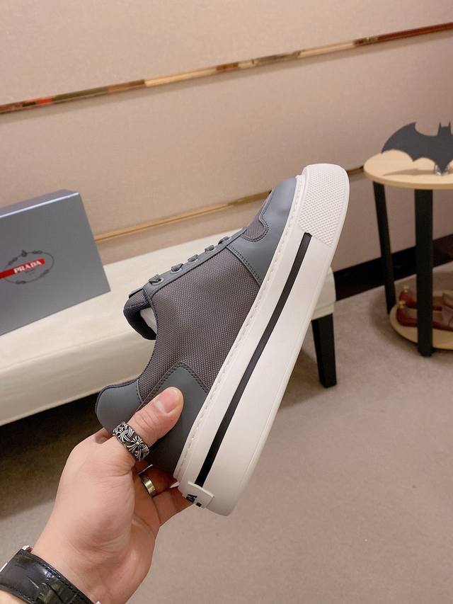 调工厂P价 男装男鞋 运动原单高版本 高品质新款Prada 普拉达 专柜同步上市, 新款男鞋、面料精选高科技滴胶工艺制作而成。内里:全牛皮内里。高端气垫开模防滑橡胶大底,精美线条、简约大气,上脚舒服上挡次、休闲旅游。码数:38一44 可定做45