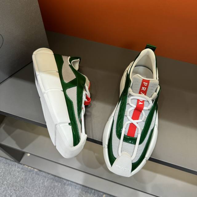 调工厂p价 男装男鞋 运动原单 码数38-45 prada 普拉达男士系带皮革休闲运动鞋,鞋面牛皮拼接透气网面打造 柔软舒适透气 鞋舌装饰prada品牌字母标识