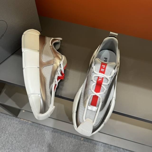 调工厂p价 男装男鞋 运动原单 码数38-45 prada 普拉达男士系带皮革休闲运动鞋,鞋面牛皮拼接透气网面打造 柔软舒适透气 鞋舌装饰prada品牌字母标识