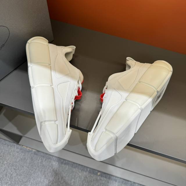 Prad*普拉达新品男士休闲鞋,这款休闲百搭,选用头层牛皮打造,橡胶大底,脚感非常舒适,运用柔和简洁的线条,鞋底轻盈而稳...