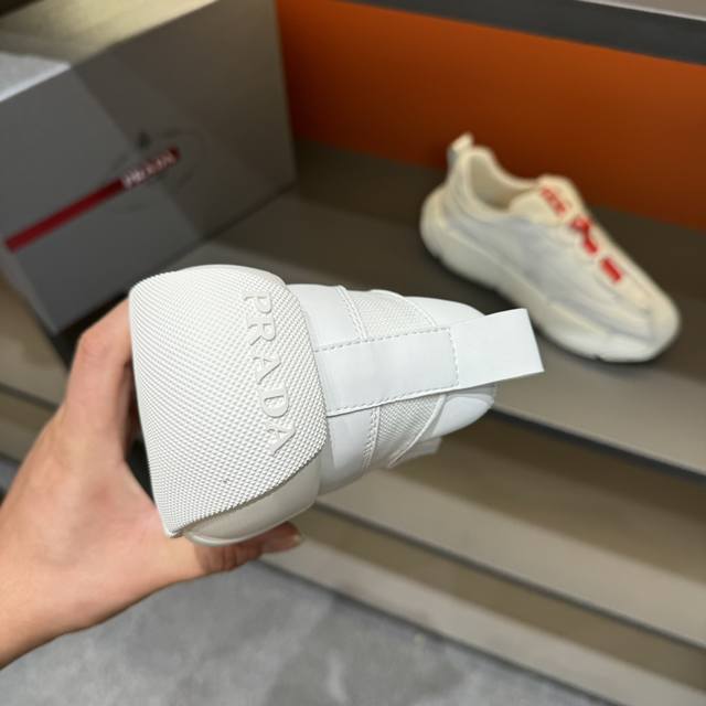 调工厂p价 男装男鞋 运动原单 码数38-45 prada 普拉达男士系带皮革休闲运动鞋,鞋面牛皮拼接透气网面打造 柔软舒适透气 鞋舌装饰prada品牌字母标识 橡胶厚底与红标鞋舌相呼应 款式时尚大方 细节精工细作 一款上脚超洋气的休闲运动鞋 透气性能极佳! DDD