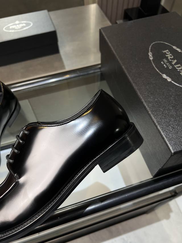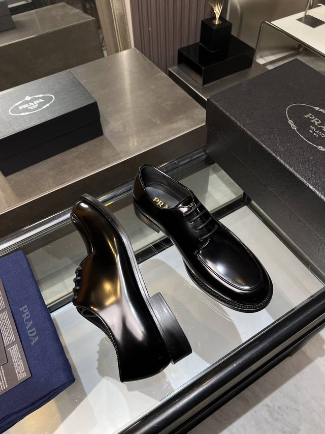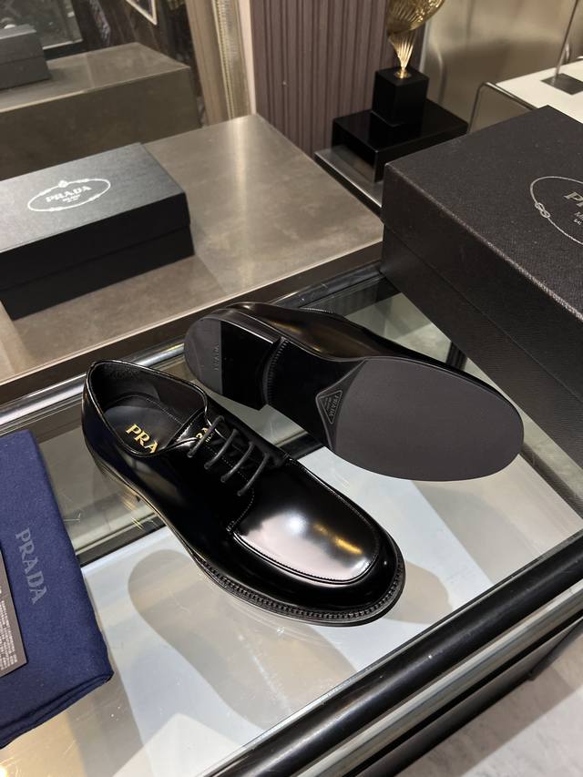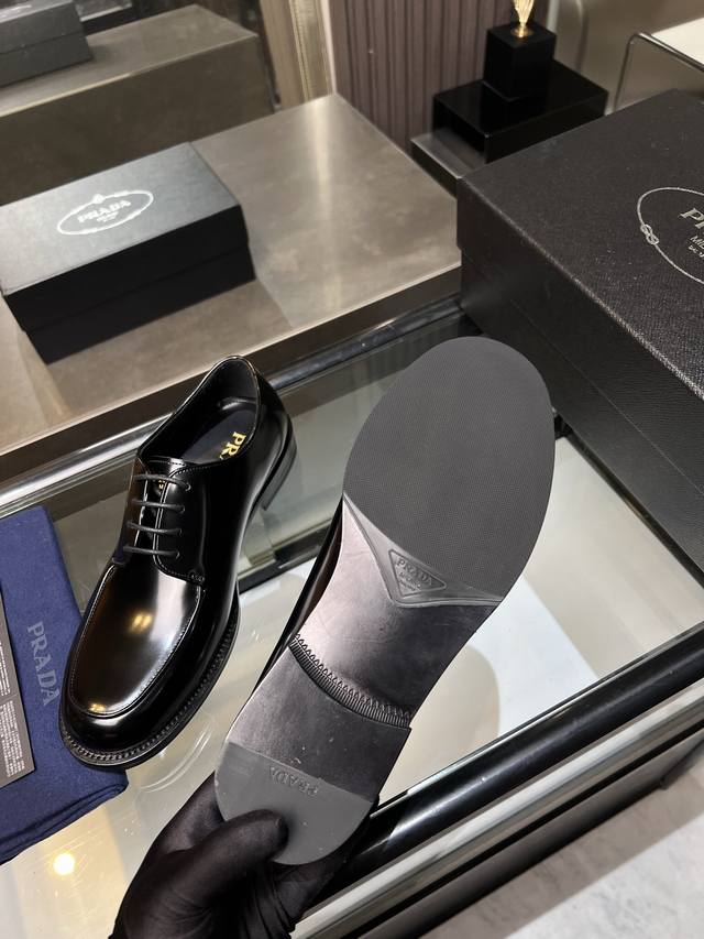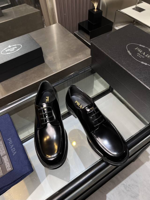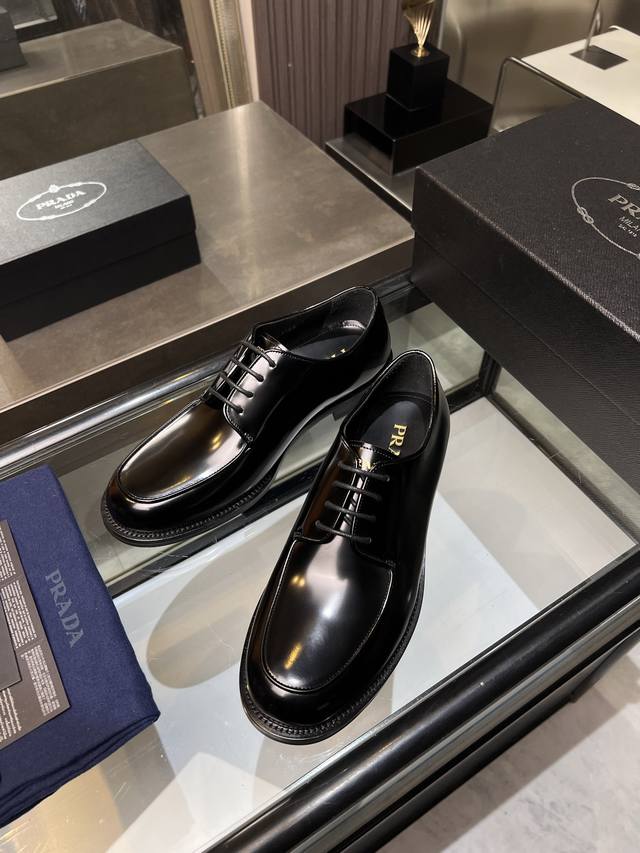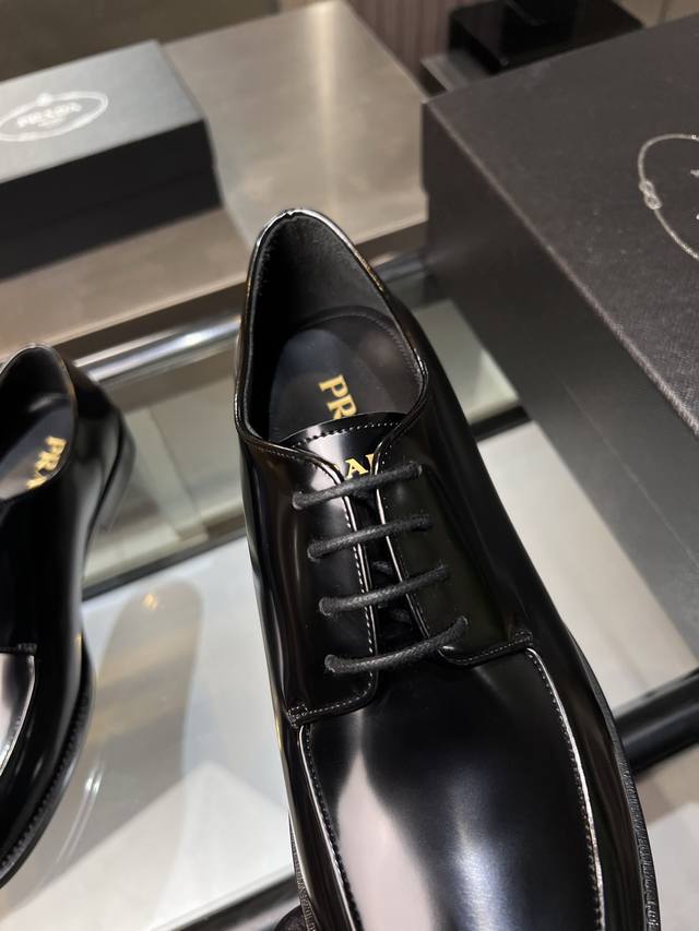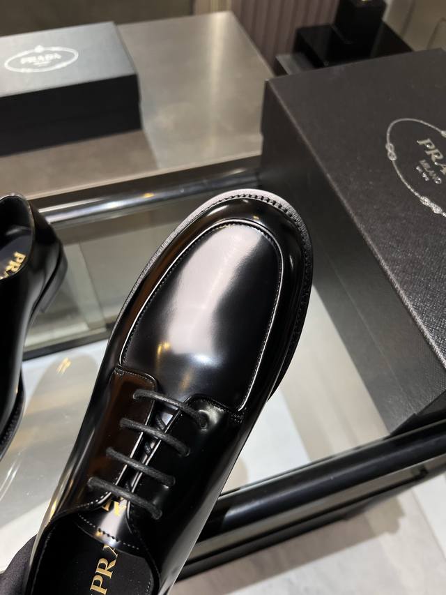 / 调工厂P价 男装男鞋 运动原单 Prada普拉达高端男士热卖精品休闲皮鞋,进口牛皮革德比鞋将工致元素与摩登魅力融合,韧性强耐折不易变形,经久耐穿!进口水染牛皮内