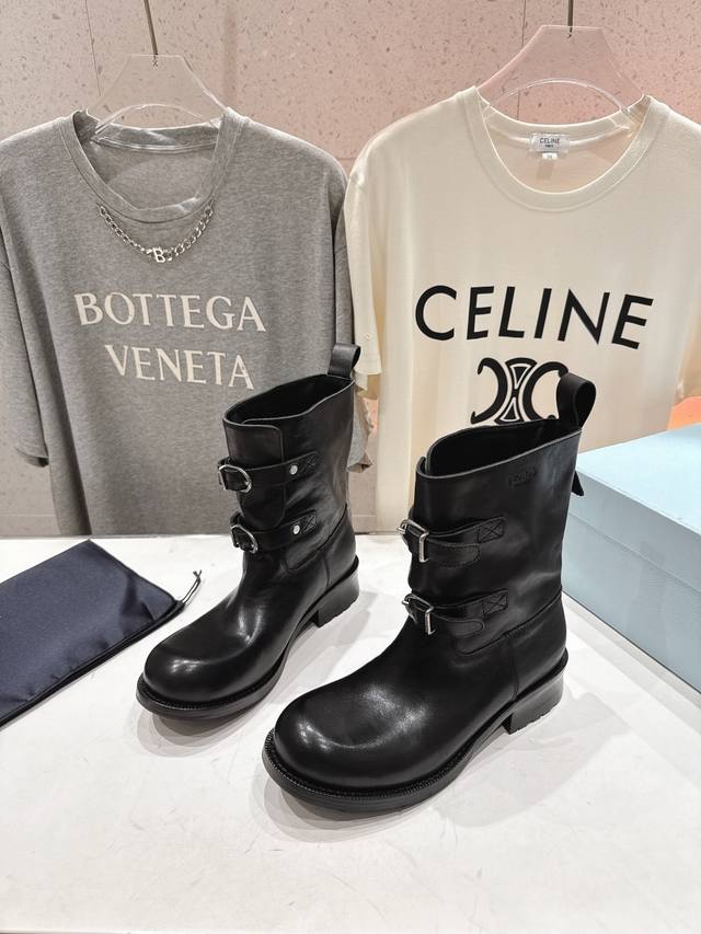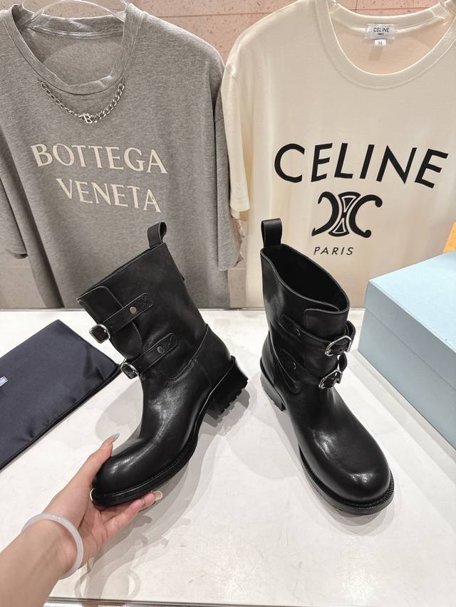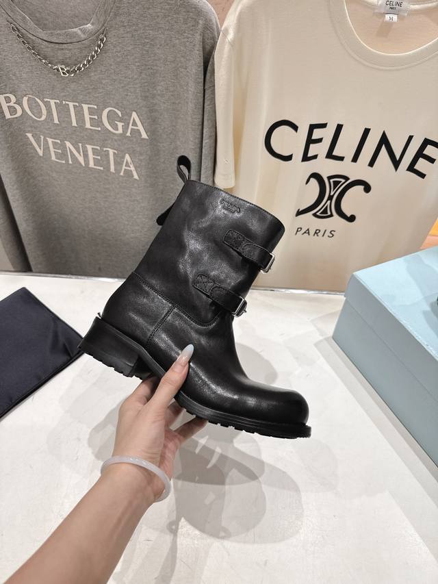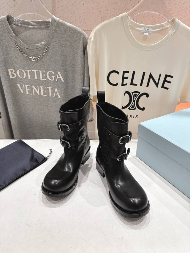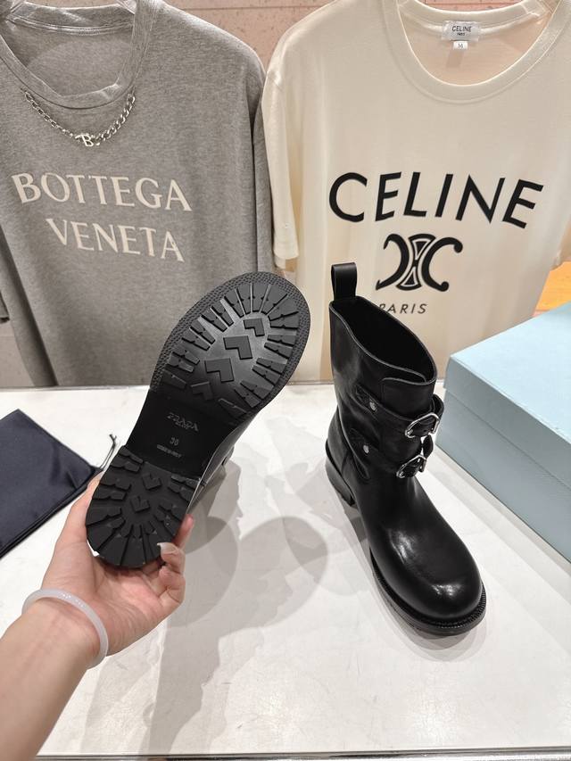 高版本出厂 prada 普拉达F041 2025Ss最新厚底双搭扣马丁靴骑士靴短靴,非常耐看的一款 走秀款骑士靴 原版复刻 版型超正 超经典百搭款 超级耐看 耐