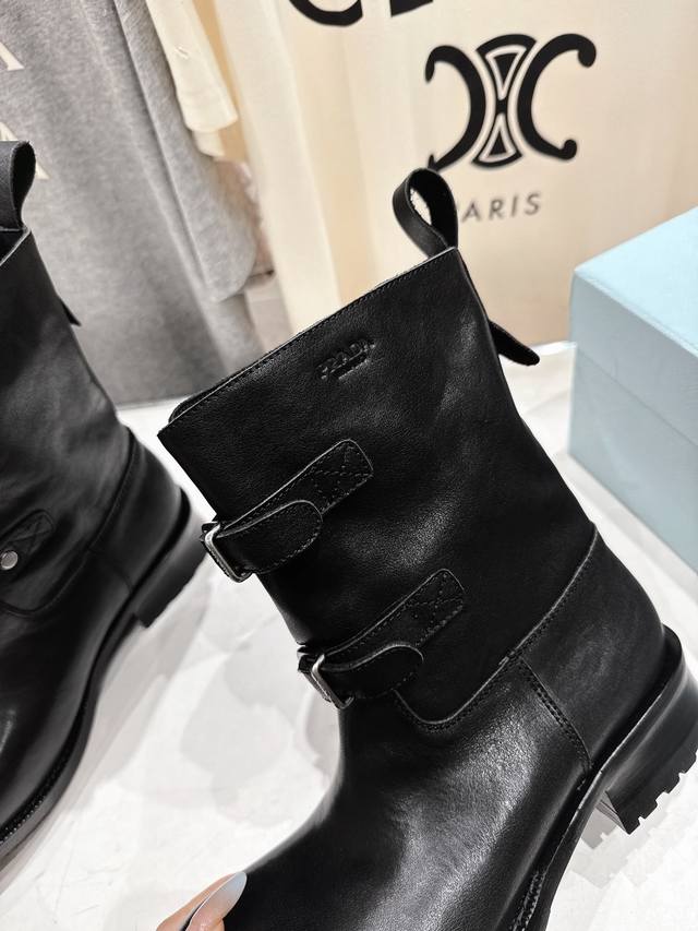 / 高版本出厂 prada 普拉达F041 2025Ss最新厚底双搭扣马丁靴骑士靴短靴,非常耐看的一款 走秀款骑士靴 原版复刻 版型超正 超经典百搭款 超级耐看 耐