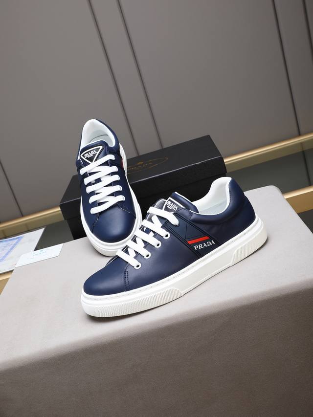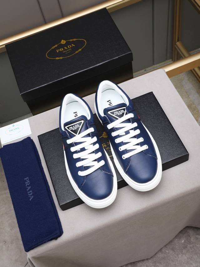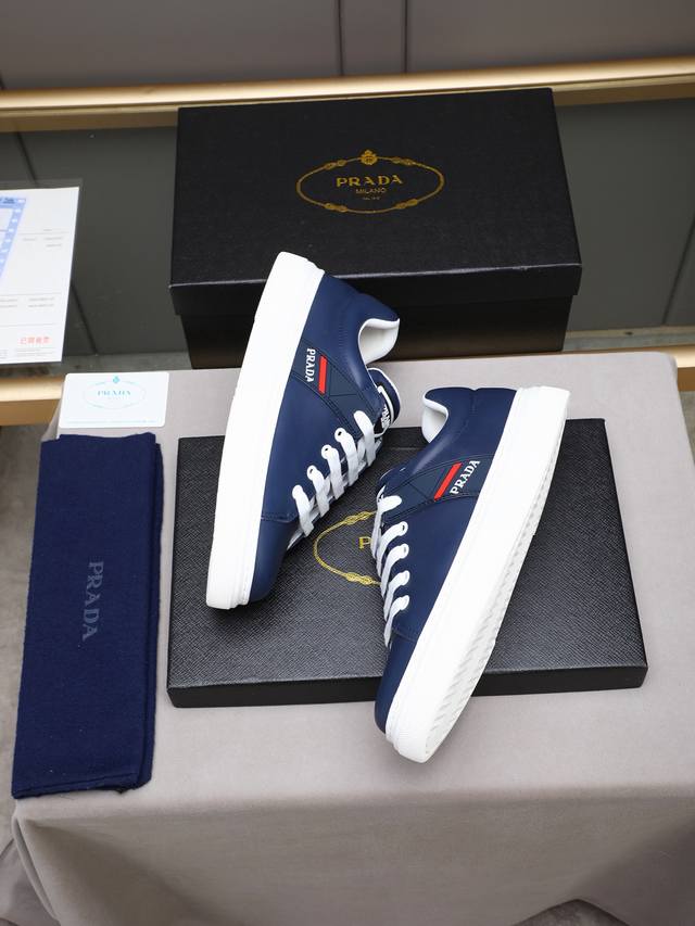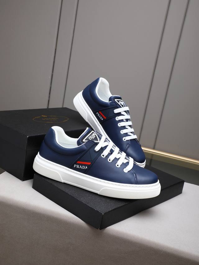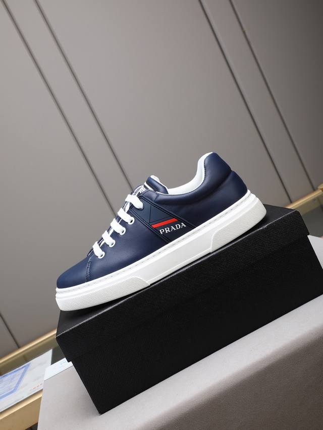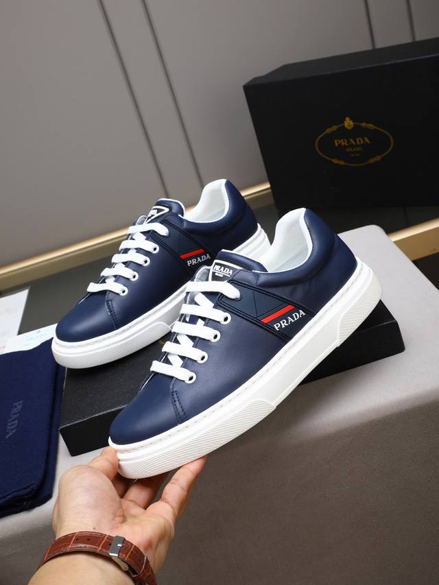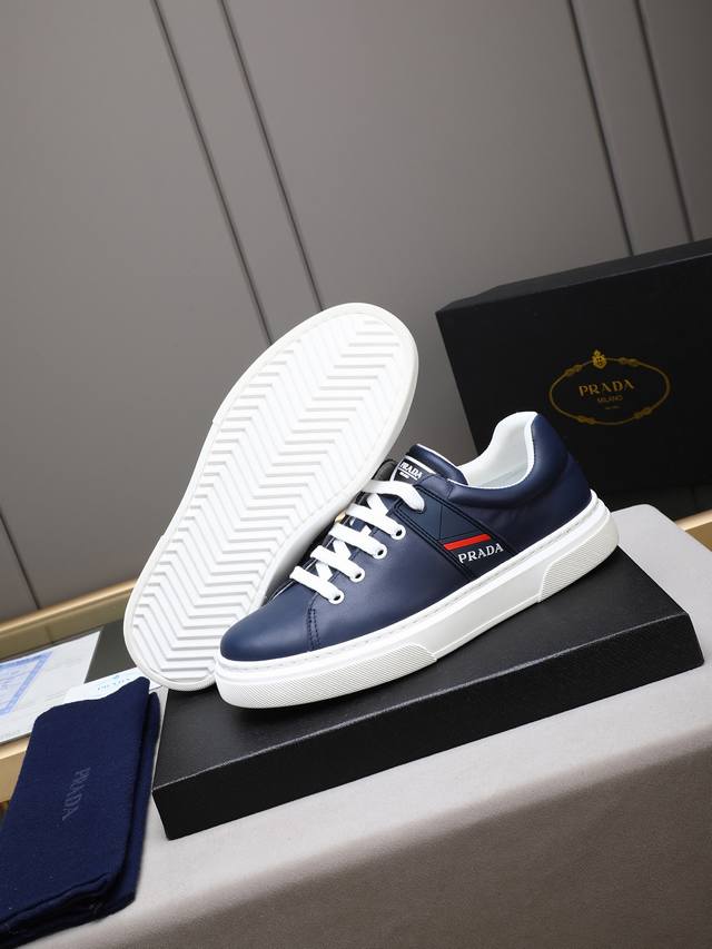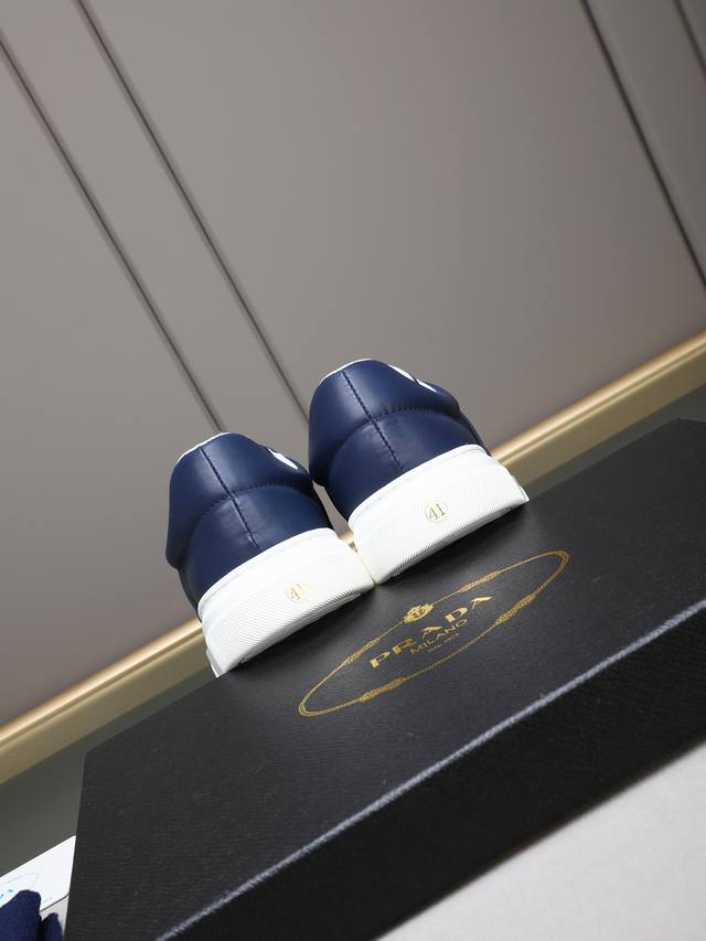 Prad*普拉达新品男士休闲鞋,这款休闲百搭,选用头层牛皮打造,橡胶大底,脚感非常舒适,运用柔和简洁的线条,鞋底轻盈而稳固,鞋舌带有标志性Logo,效果彰显别具