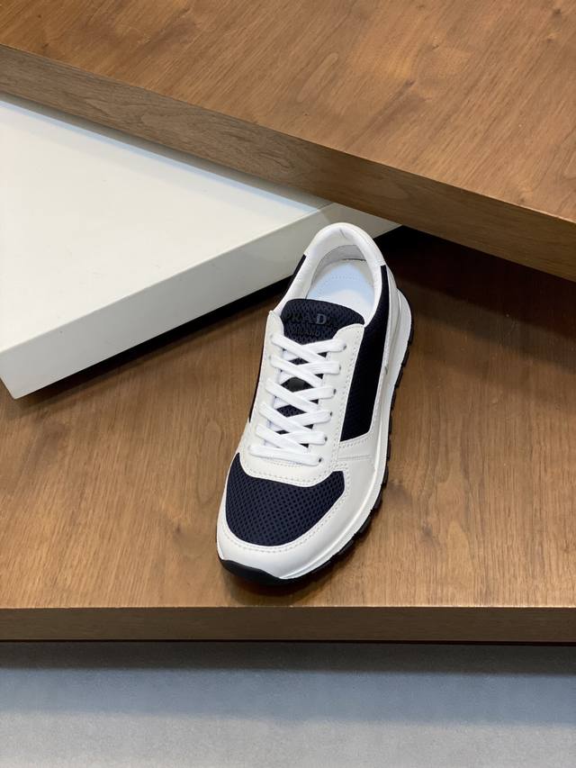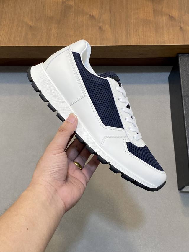 Prada男士新款运动休闲男鞋 这款鞋面采用进口小牛皮和专属客供网布打造,外侧饰以P家经典金属三角珐琅徽标,内里皮里,垫脚牛皮,大底采用防滑运动专属带Logo橡胶大底,脚感很好,洋气时髦,标准运动版型,上脚非常好看!配原盒包装防尘袋! L皮鞋码数:39 40 41 42 43 44 原盒包装+防尘袋