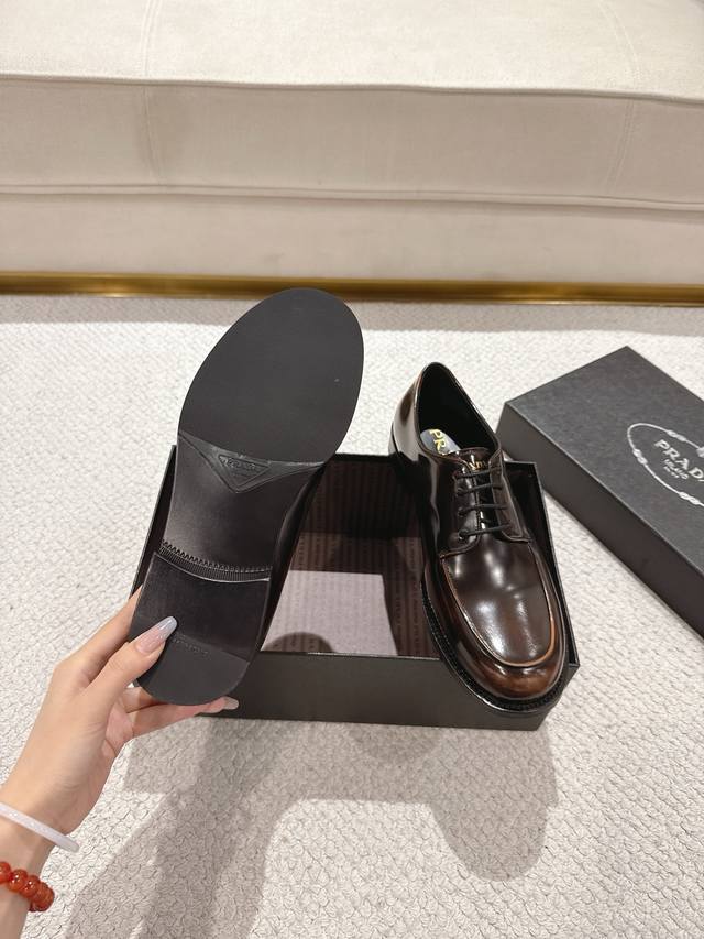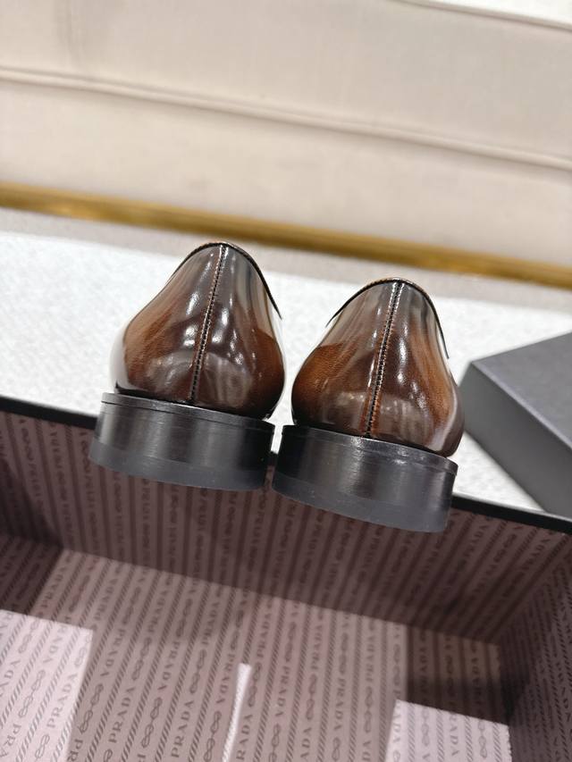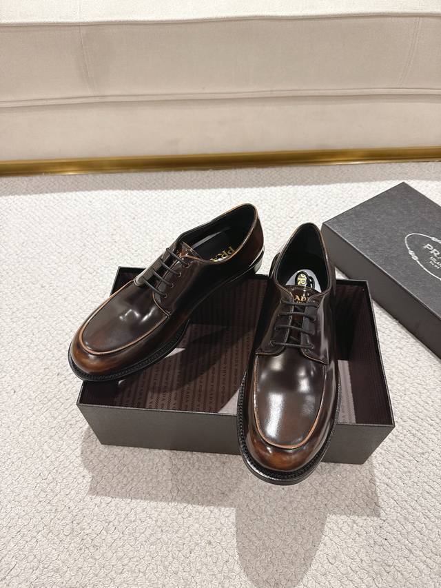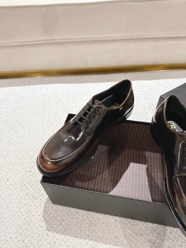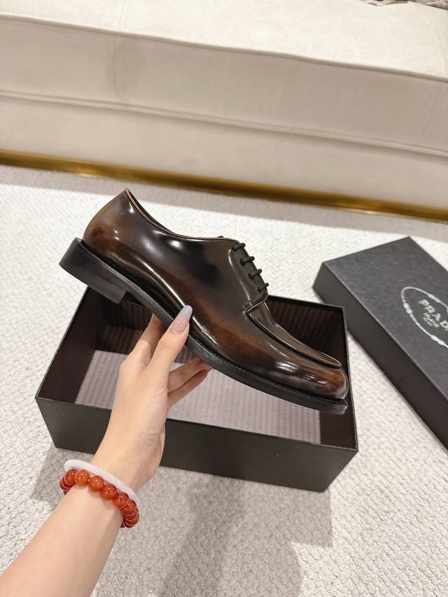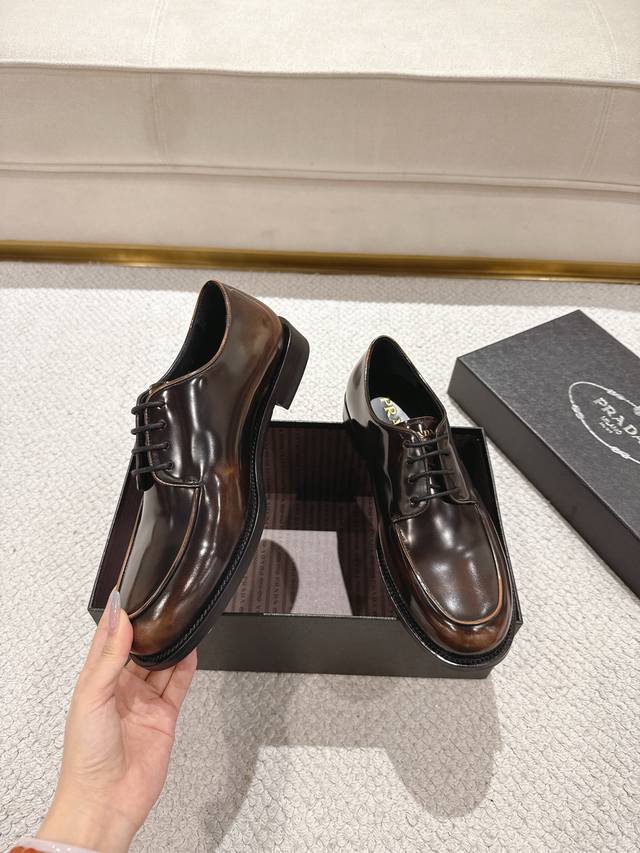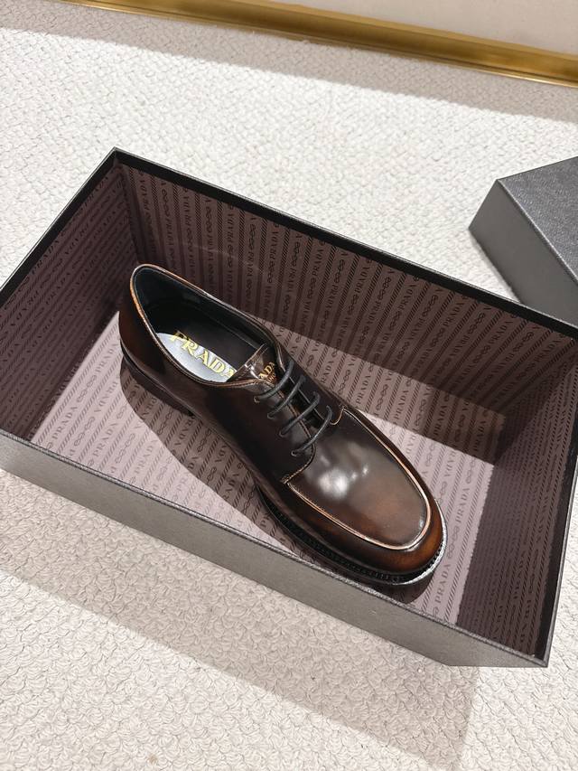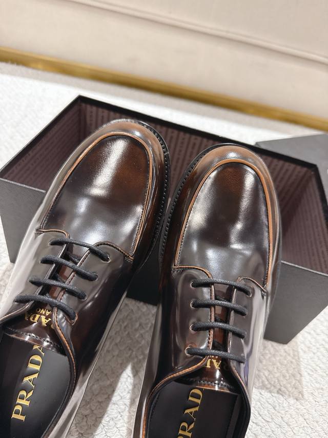 prada 普拉达 新款男士正装德比鞋出货 莞产精品 懂货的赶紧下手! 采用进口亮面擦色牛皮制作 柔软舒适不起皱褶 德比鞋系带款式配打蜡鞋带 优雅大气 高品质精