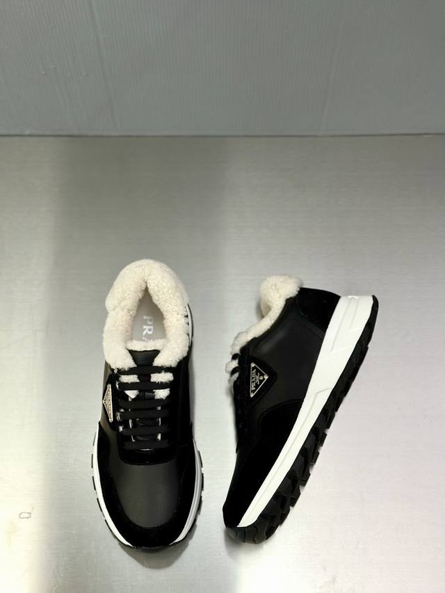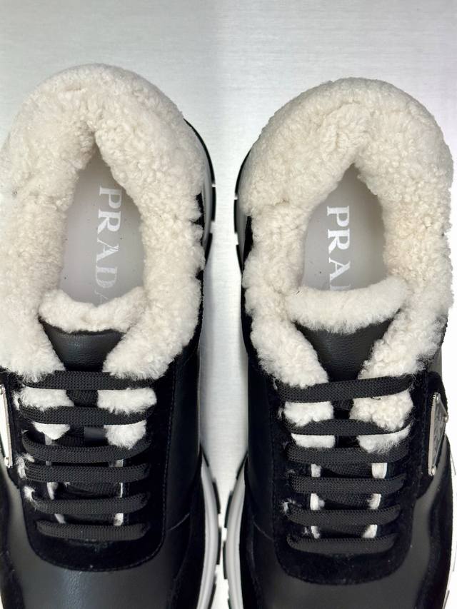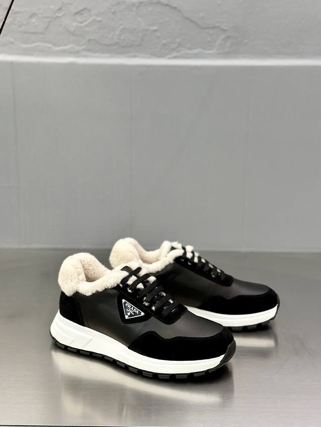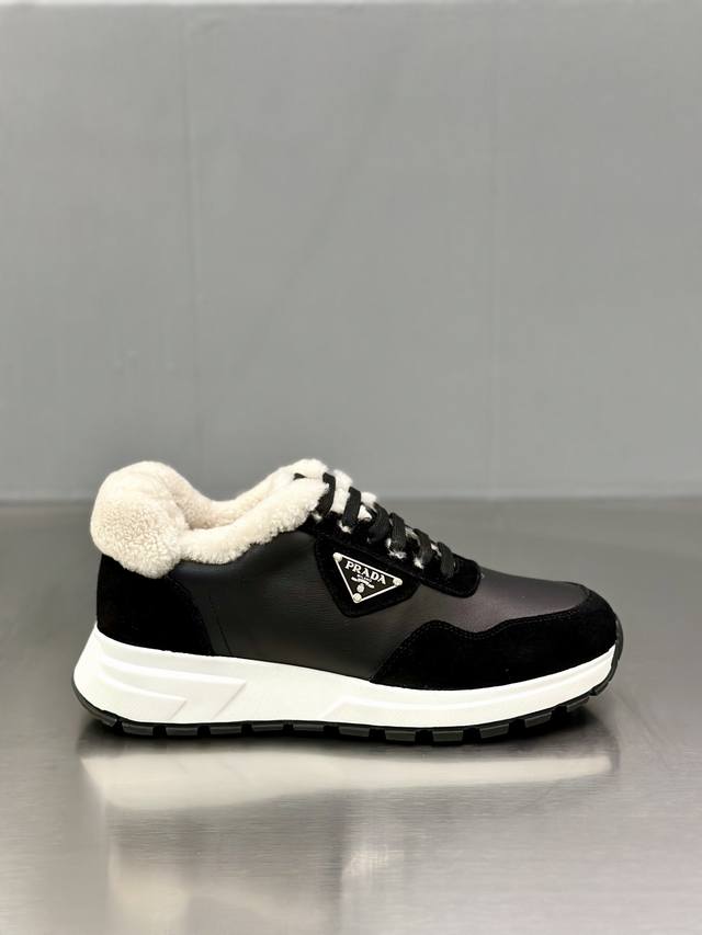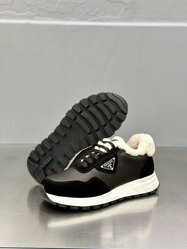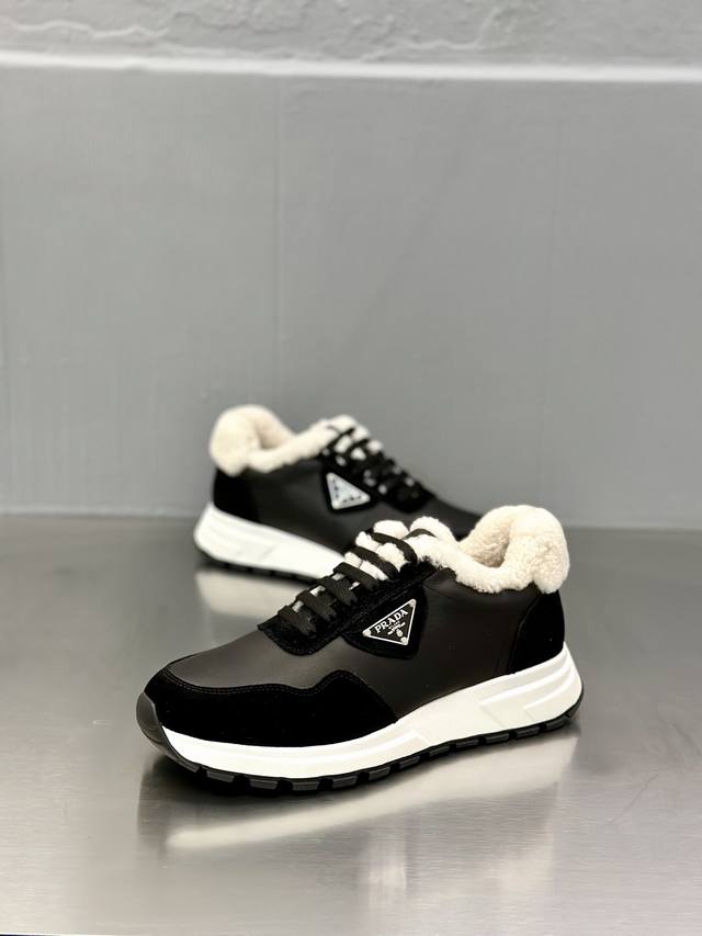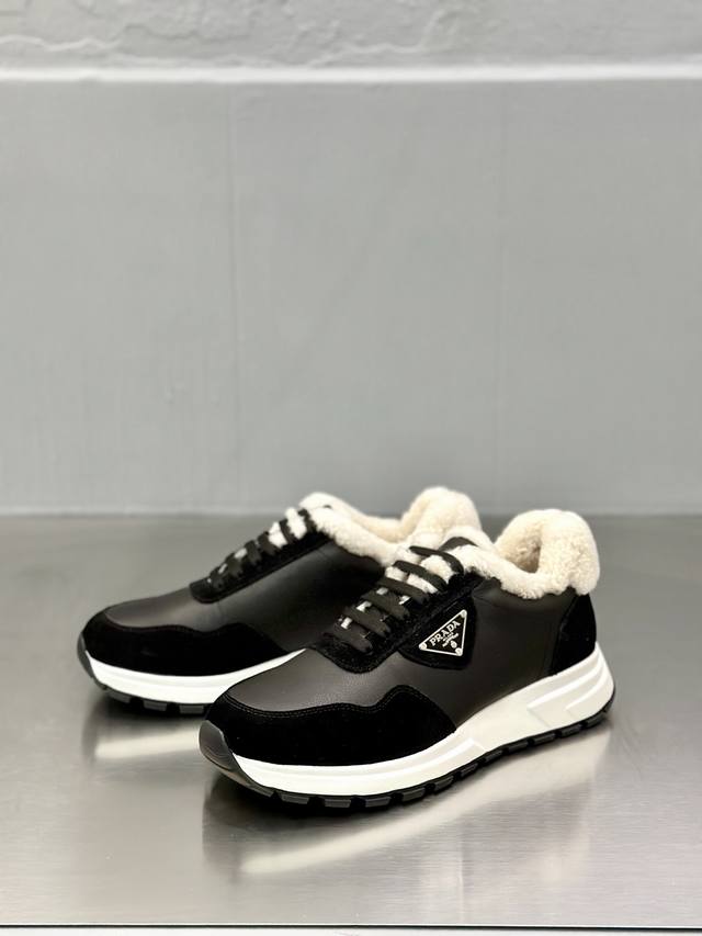 prada 普拉达 男士新款羊毛运动鞋 这款运动鞋呈现现代版型,以利落线条与流畅细节重新演绎品牌典藏款型。鞋履采用小牛皮革和科技织物打造,外侧饰有三角金属徽标,