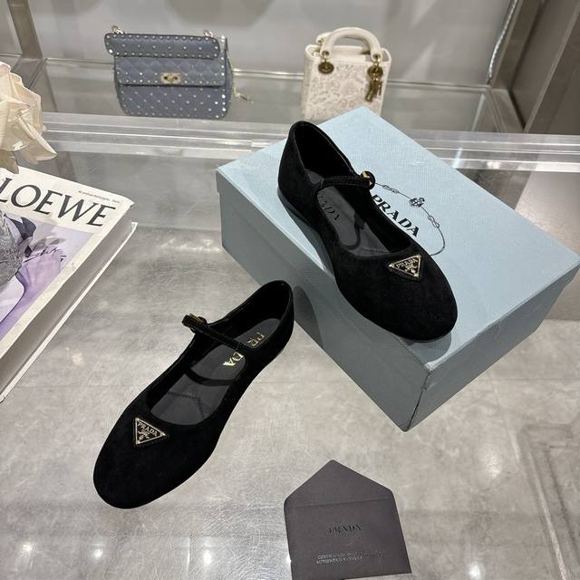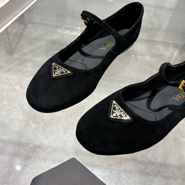 / prada 普拉达2025Ss春夏新品 闪亮登场 玛丽珍平底芭蕾舞鞋 柔软舒适 ,小红书各大博主推荐,妥妥的学院风通勤1-1开发 圆头金色三角标扣 出厂价p 面