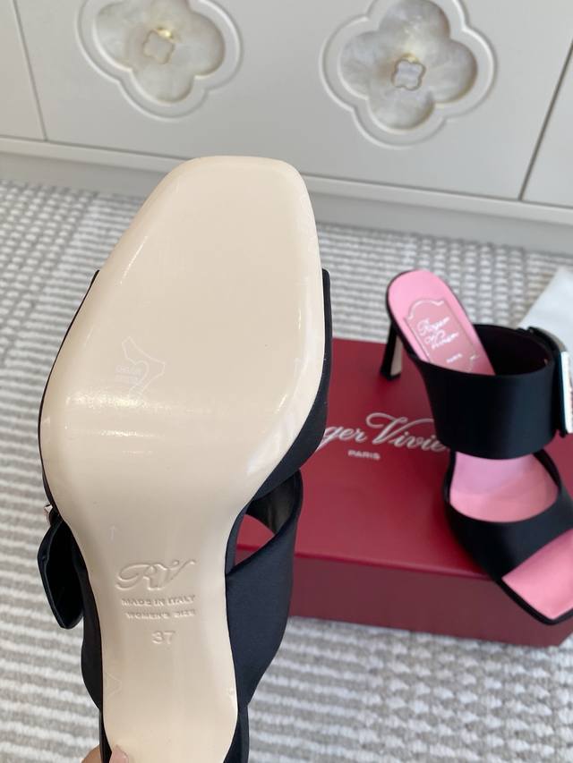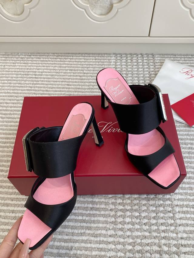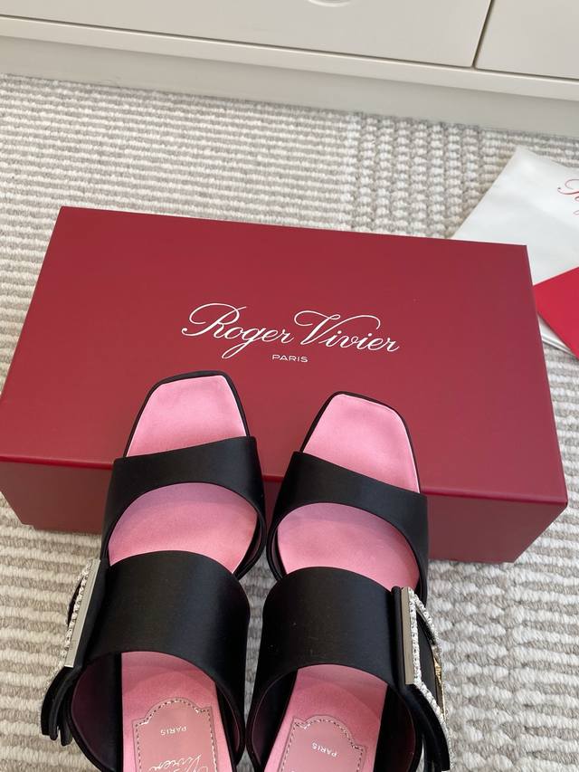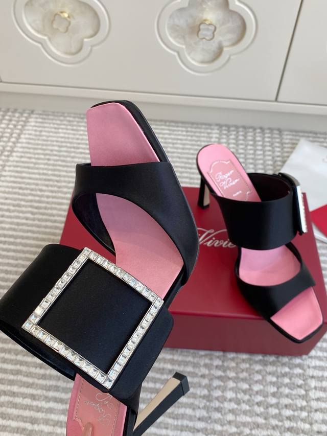 Roger Vivier Fw25 New Arrival~钻扣高跟方头拖鞋 DDD Rv家的Trompette系列高跟鞋,丝缎+方形水钻扣,超有辨识度走路稳又