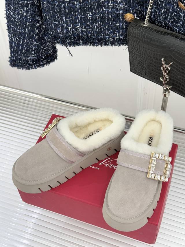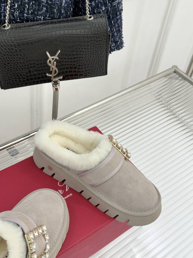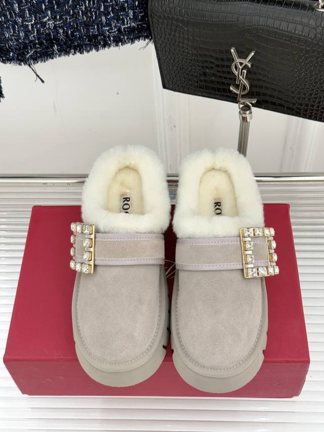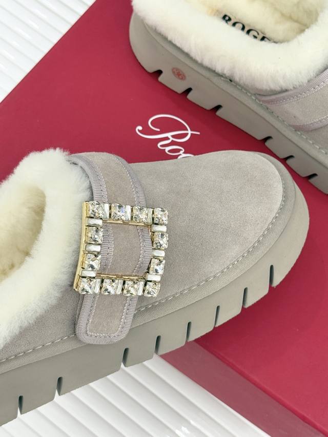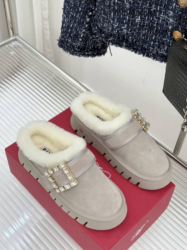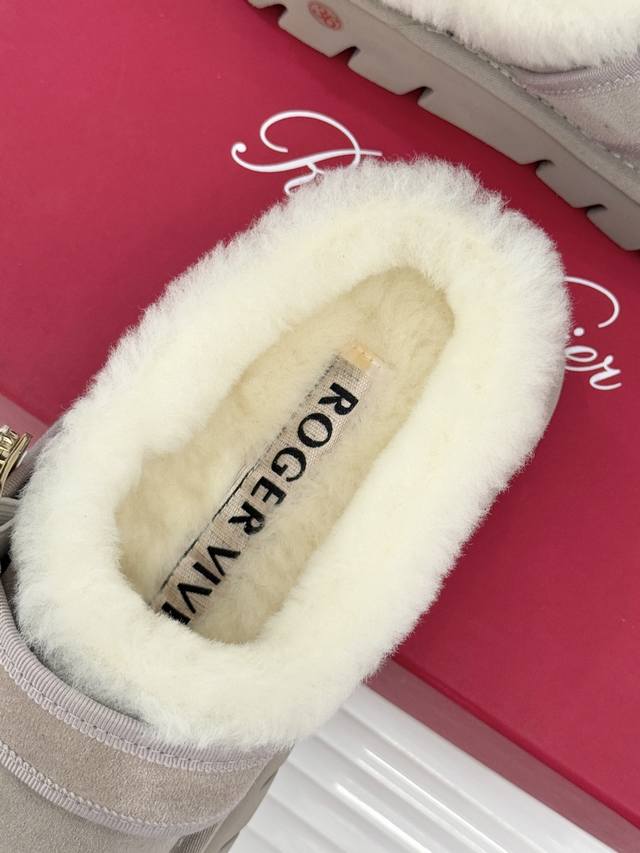 厂价P矮 高 Roger Vivier Rv25Wf新品方钻扣 厚底雪地靴 标志性方形水钻扣是视觉焦点 施华洛世奇钻饰星辰般的璀璨 直边与圆角的几何平衡里 藏着品牌半个多世纪的设计哲思 恰如女性独立而温婉的姿态 意大利匠心工艺雕琢的鞋面 与澳洲进口绵羊毛内里包裹 让每一步都踏在春日般的暖意中 厚底设计暗藏巧思 堪称小个子福音 既延续品牌厚底鞋履的时尚张力 又以橡胶发泡大底筑牢防滑根基 它既是抵御严寒的保暖利器 亦是点亮造型的点睛之笔 让经典方扣的光芒 在寒冬里持续闪耀。 Size:35-39 40 41定