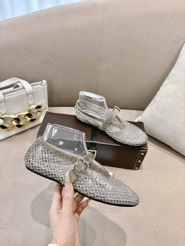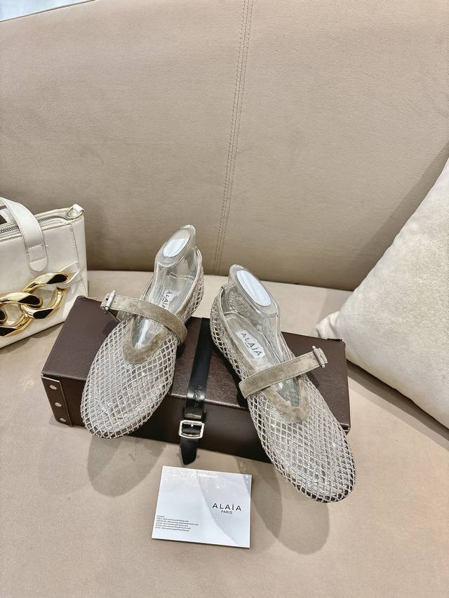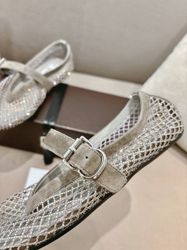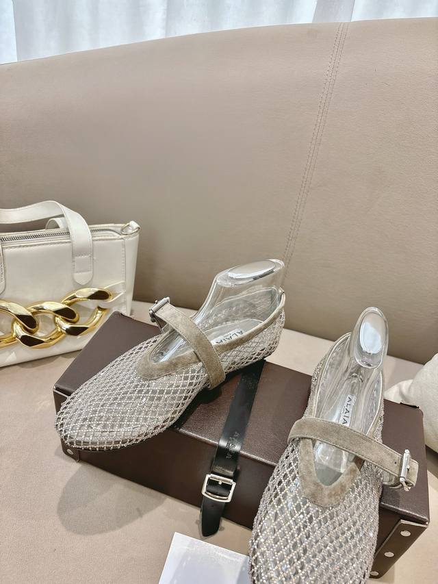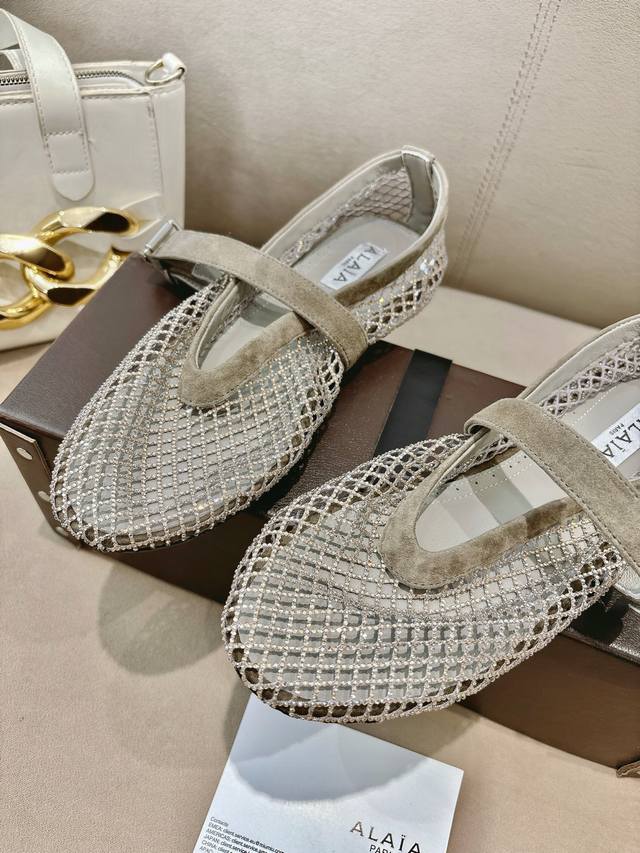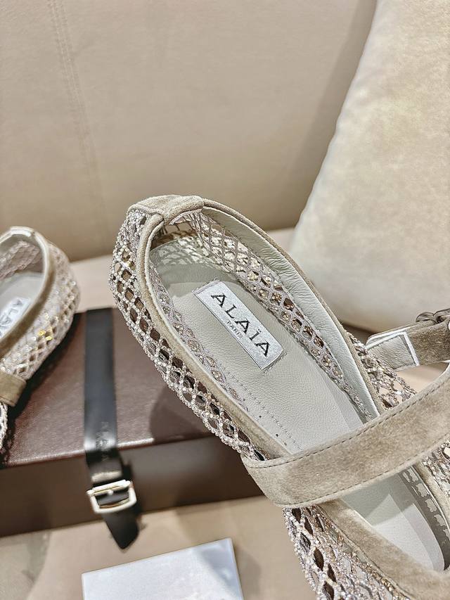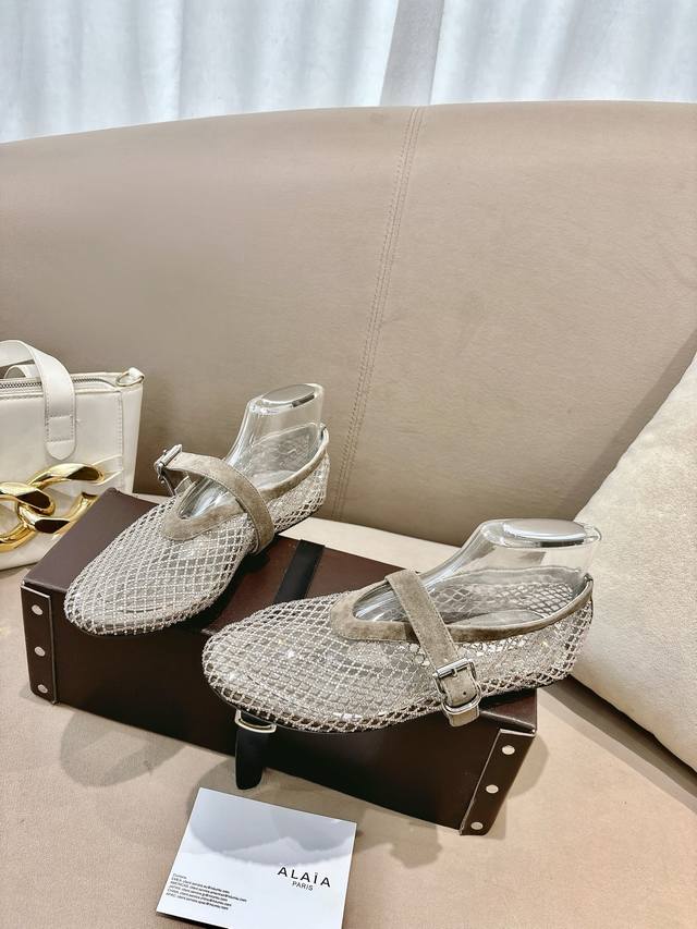 2026 春夏Alaia 镶钻渔网芭蕾鞋 DDD Alaia这款镶钻渔网芭蕾鞋,麂皮+渔网编织,点缀上千施华洛世奇水钻,银河繁星感超梦幻!经典玛丽珍鞋型,一字扣
